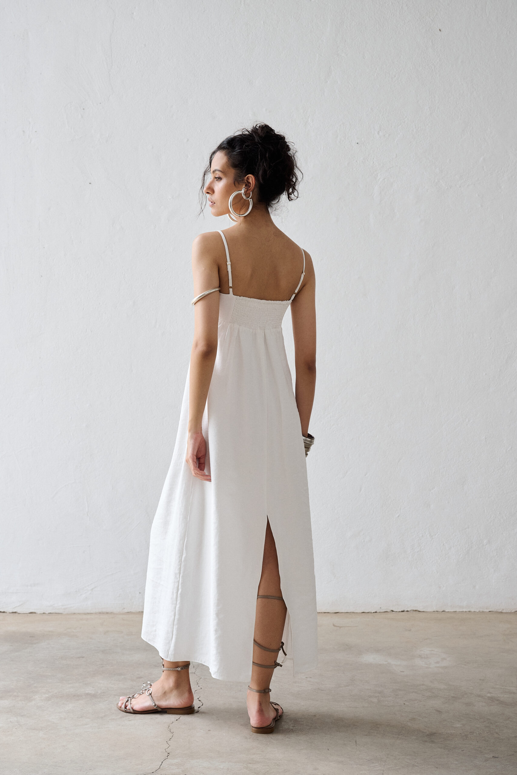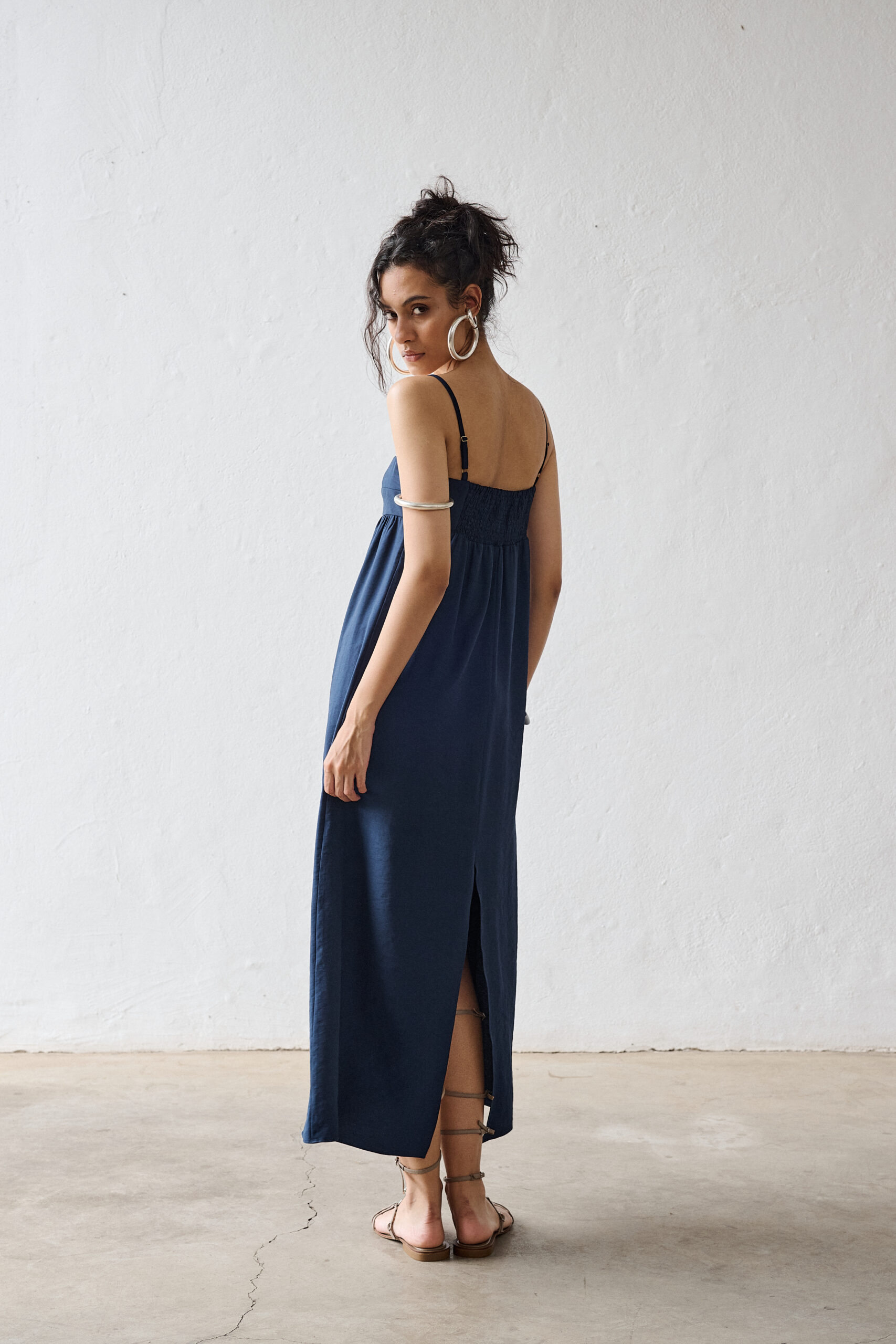 Seu design minimalista ganha destaque com o recorte logo abaixo do busto, que cria um caimento suave ao longo do corpo. Nas costas, o elástico franzido proporciona ajuste confortável, acompanhado por uma fenda posterior discreta que adiciona feminilidade e fluidez ao caminhar.