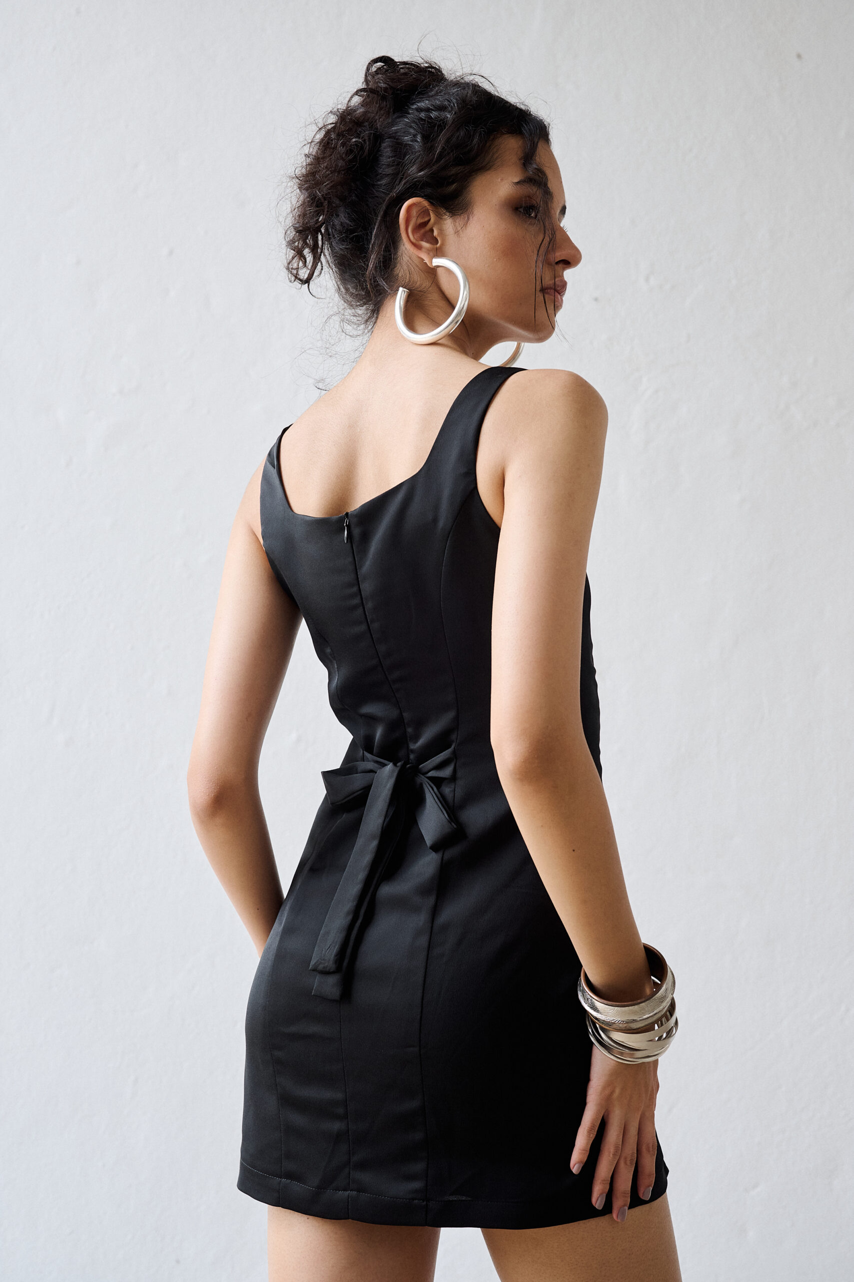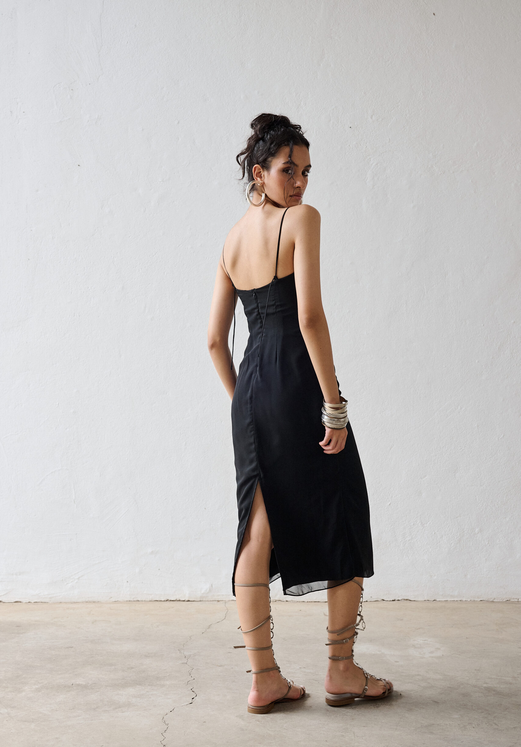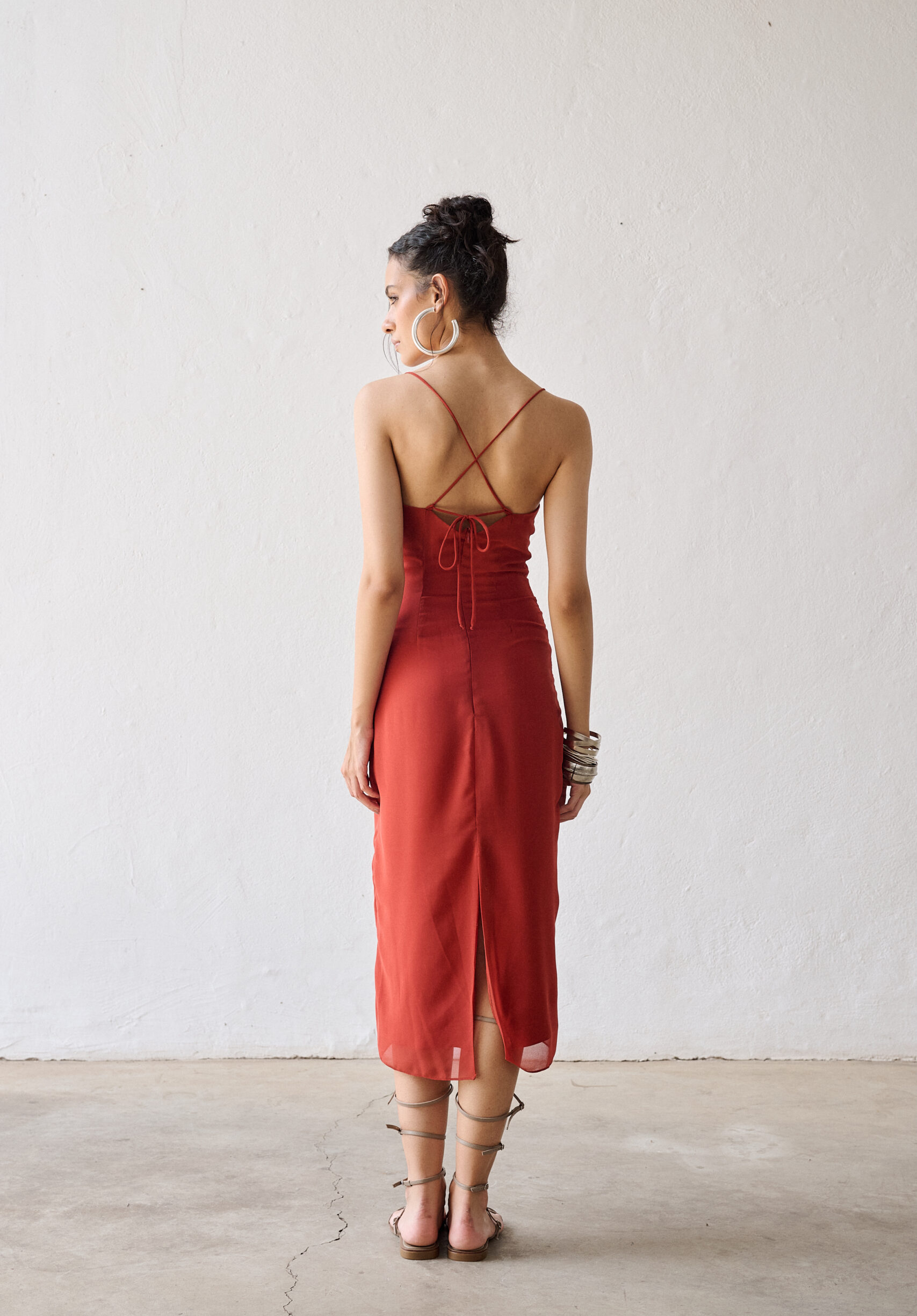 Nas costas, o toque especial fica por conta das alças cruzadas com amarração, que adicionam charme ao design e permitem um ajuste sutil ao corpo. O comprimento midi, aliado à fenda discreta posterior, garante movimento e conforto, tornando a peça ideal para diferentes ocasiões.