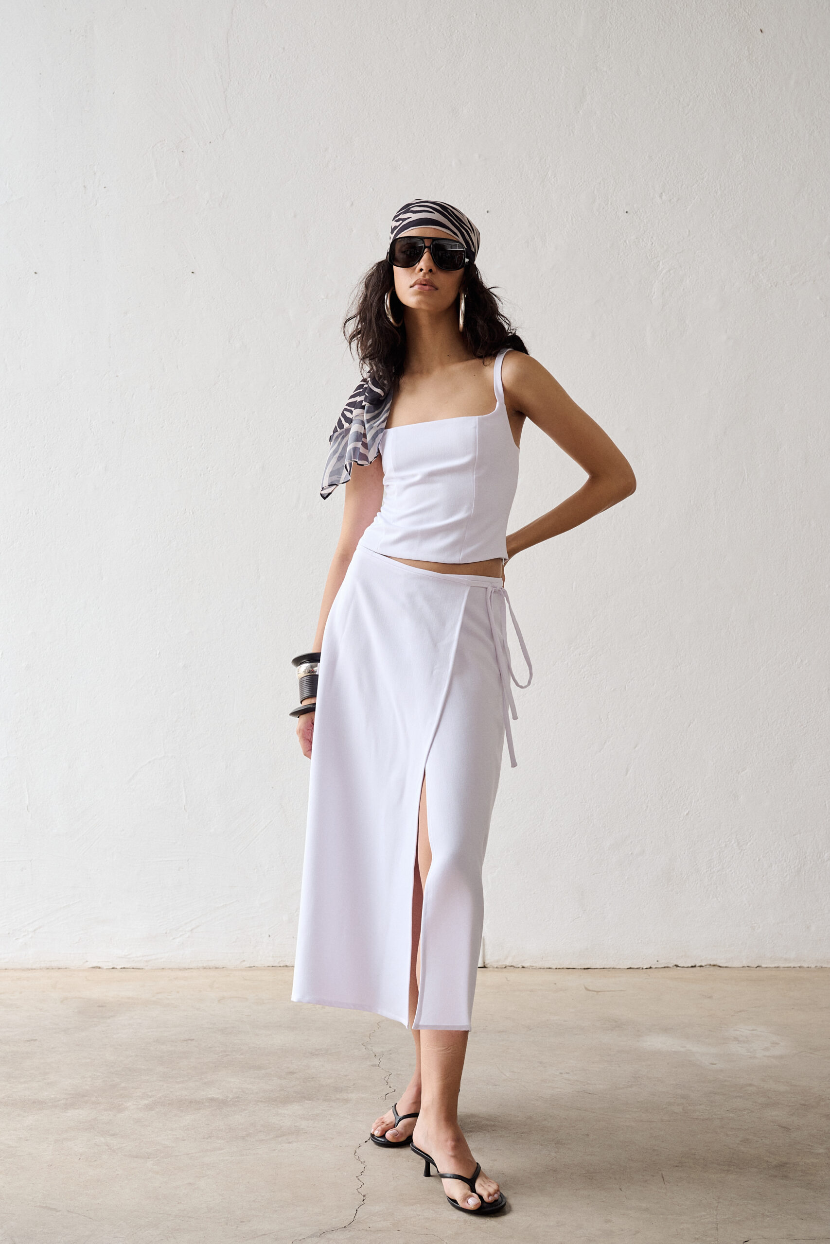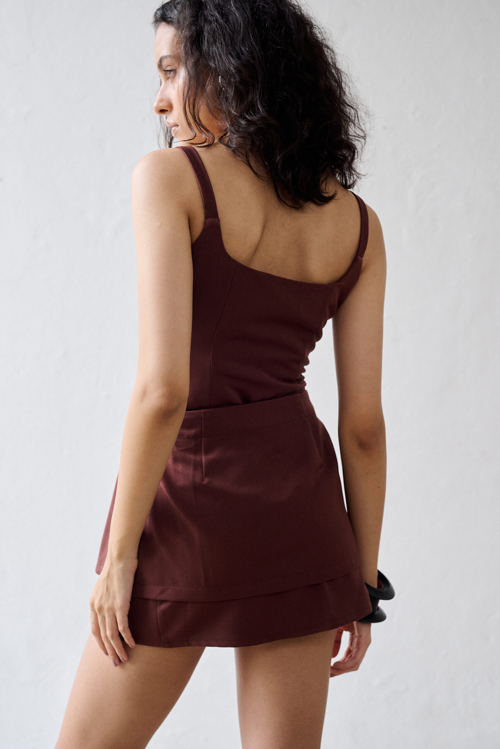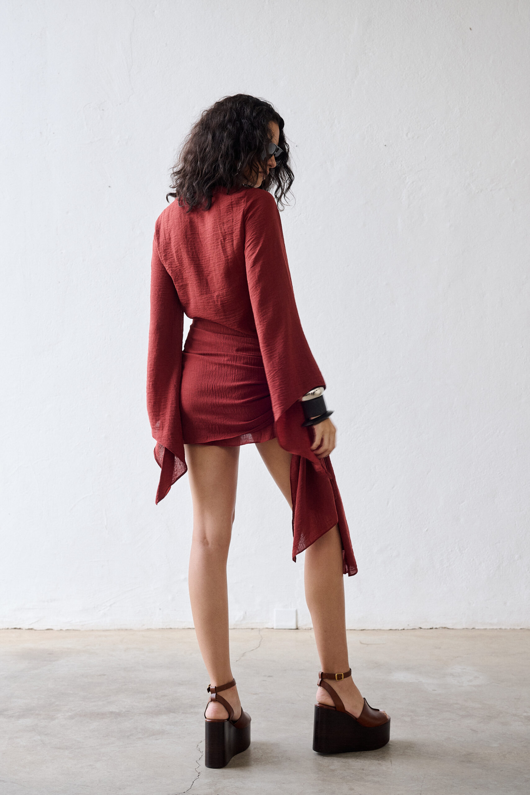 O detalhe especial do Vestido Ondina está na amarração lateral opcional e removível, que cria um efeito cruzado elegante e ajuda a definir a cintura de forma sutil. O tecido leve e o comprimento curto garantem frescor ao modelo, tornando o Ondina ideal para produções urbanas que equilibram estilo e praticidade.