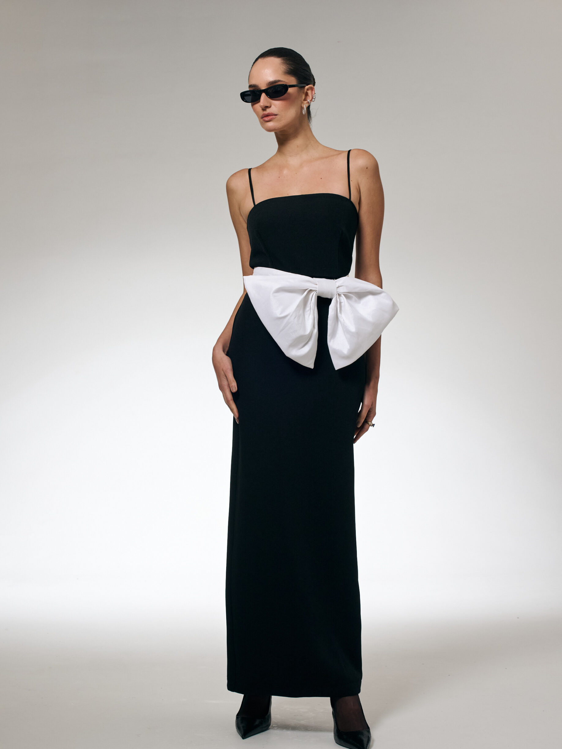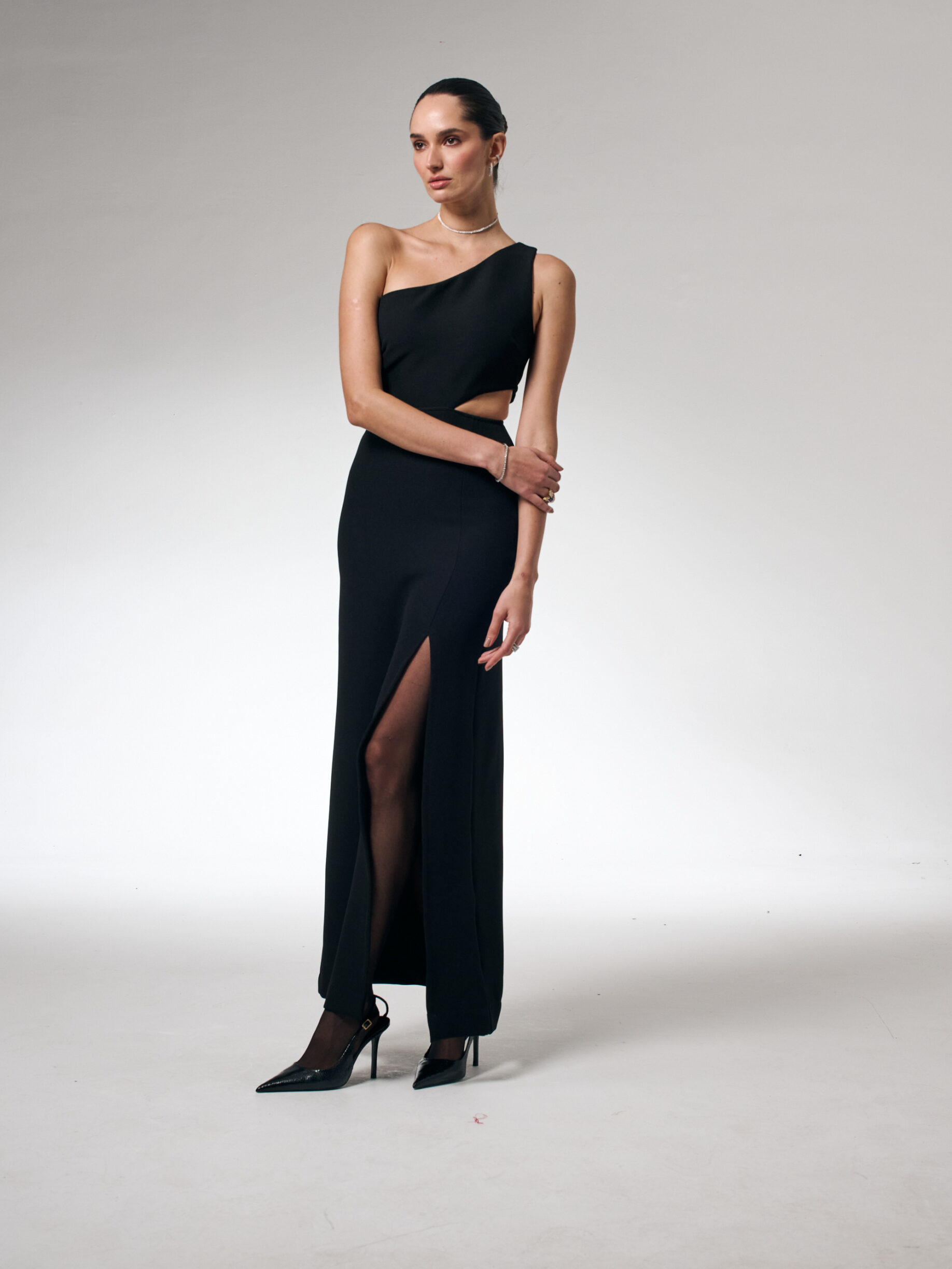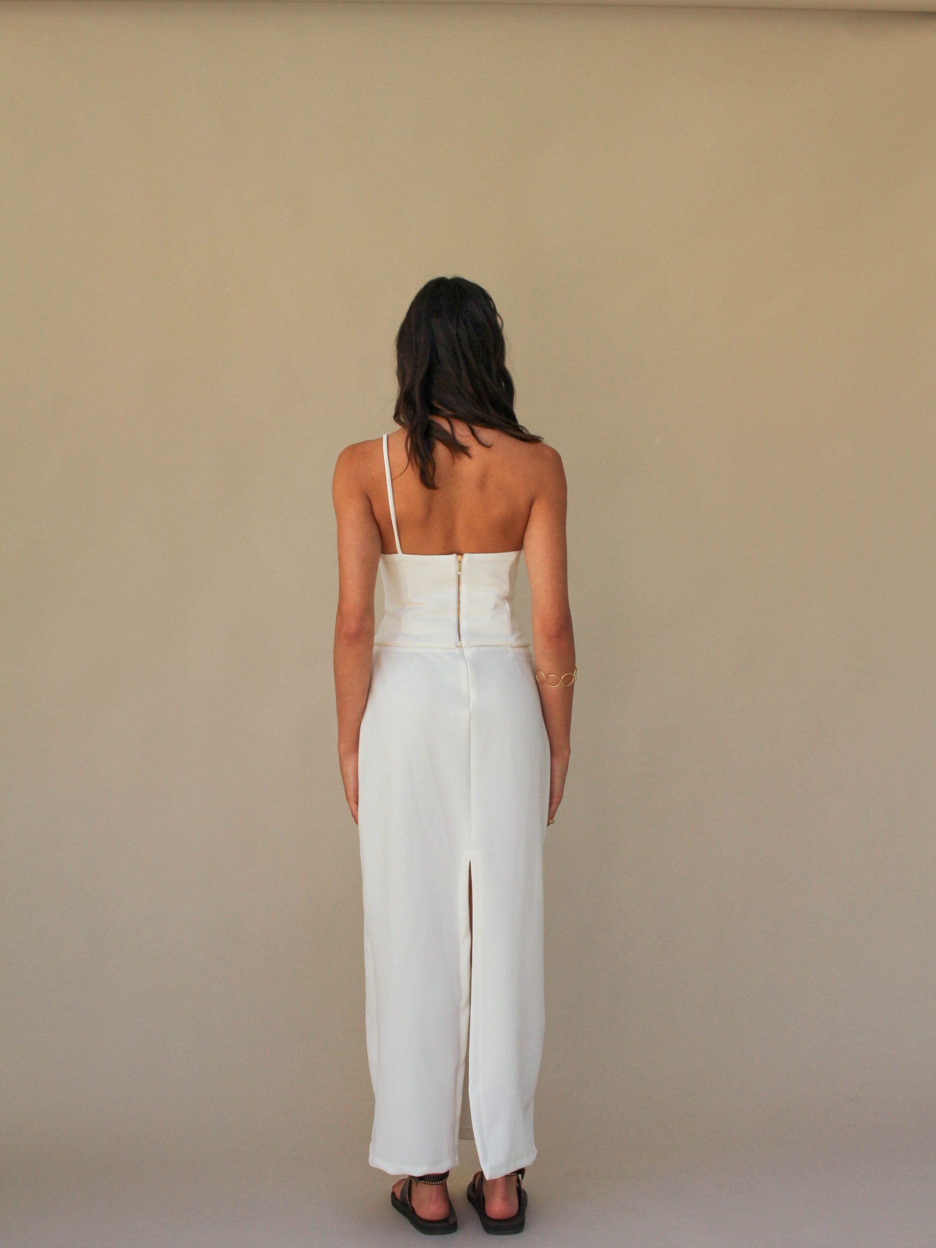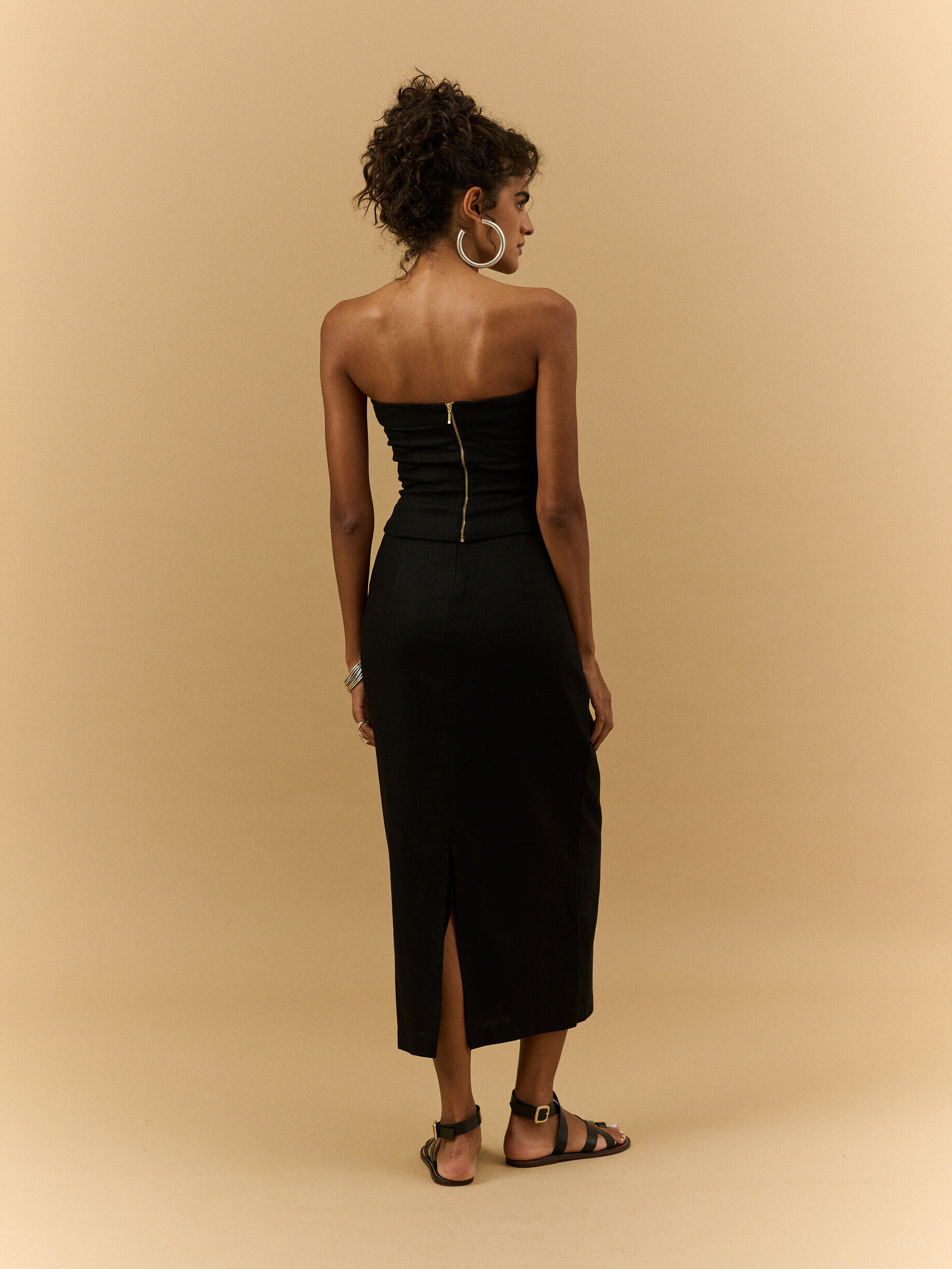 Feito em cetim bem fluido, criando um caimento bem bonito à peça, que possui uma fenda frontal.