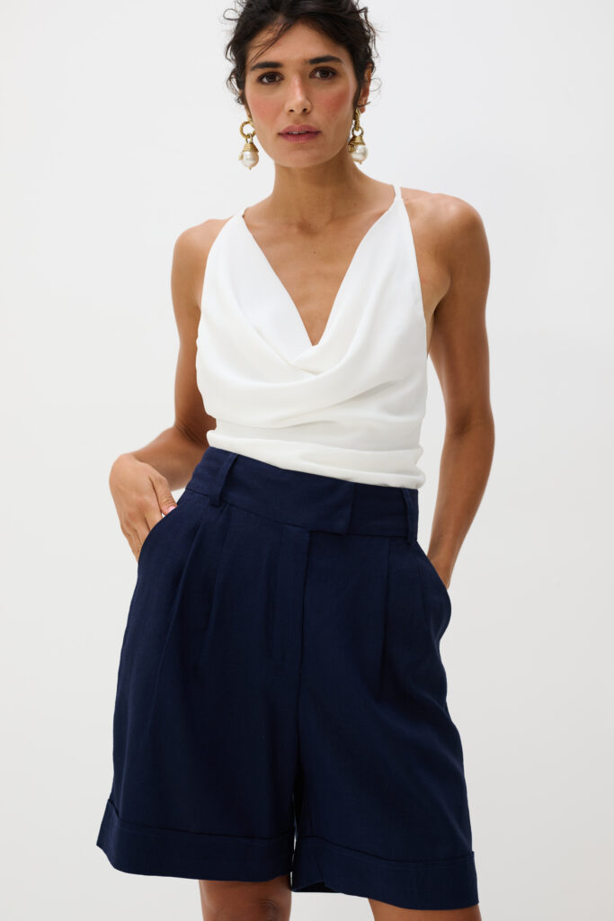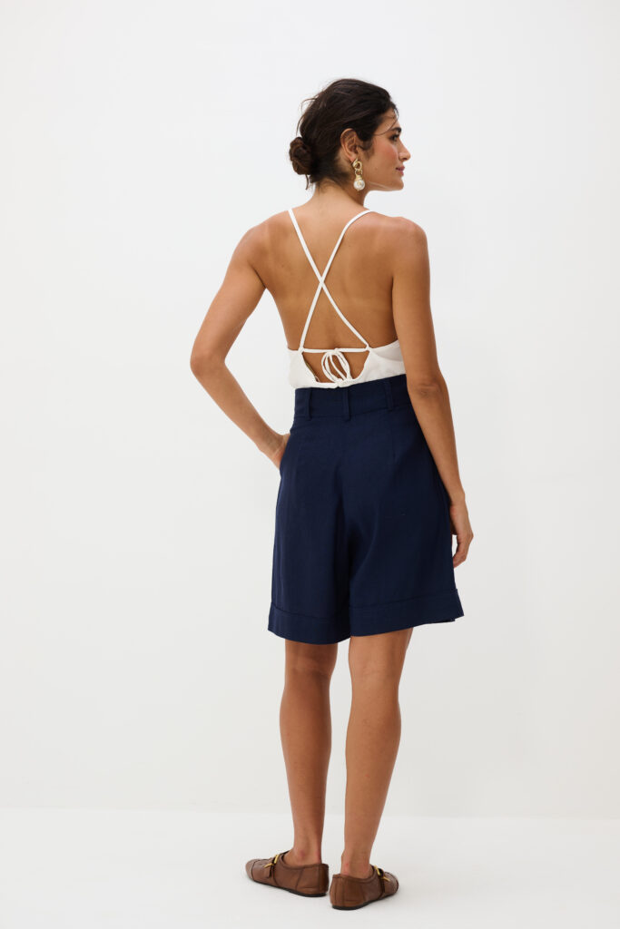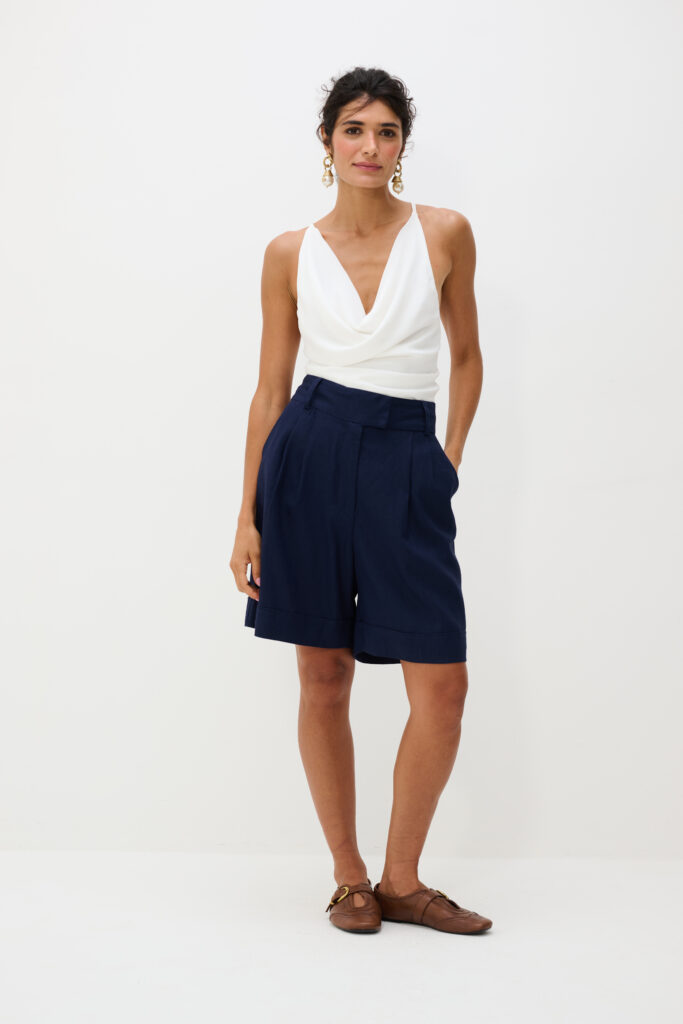 A nossa Bermuda Gaia é puro estilo! Possui a modelagem mais ampla, com corte reto, altura um pouco acima do joelho, cintura alta, pregas frontais e cós largo. Além disso, possui bolsos faca nas laterais e pences nas costas. O Fechamento frontal é por colchete duplo e zíper comum, possui passador para cinto.
