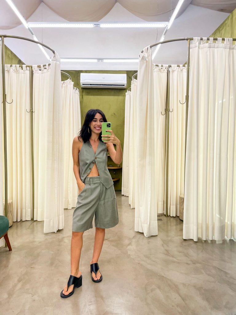 A nossa Bermuda Gaia é puro estilo! Possui a modelagem mais ampla, com corte reto, altura um pouco acima do joelho, cintura alta, pregas frontais e cós largo. Além disso, possui bolsos faca nas laterais e pences nas costas. O Fechamento frontal é por colchete duplo e zíper comum, possui passador para cinto.