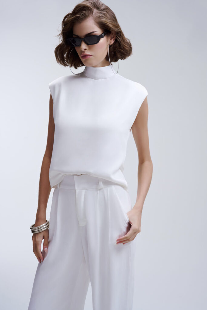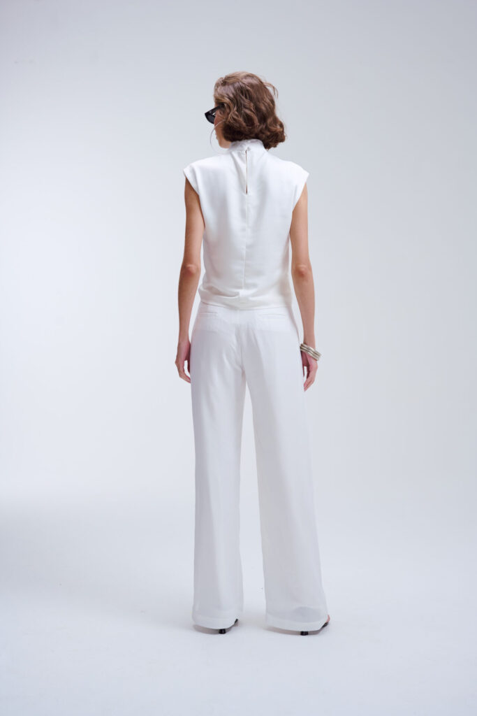 Seu design com gola alta valoriza o colo de forma refinada, enquanto a cava levemente deslocada adiciona um ar contemporâneo e despojado à peça. O destaque fica por conta da delicada abertura nas costas, que revela a pele com sutileza e adiciona charme ao visual.