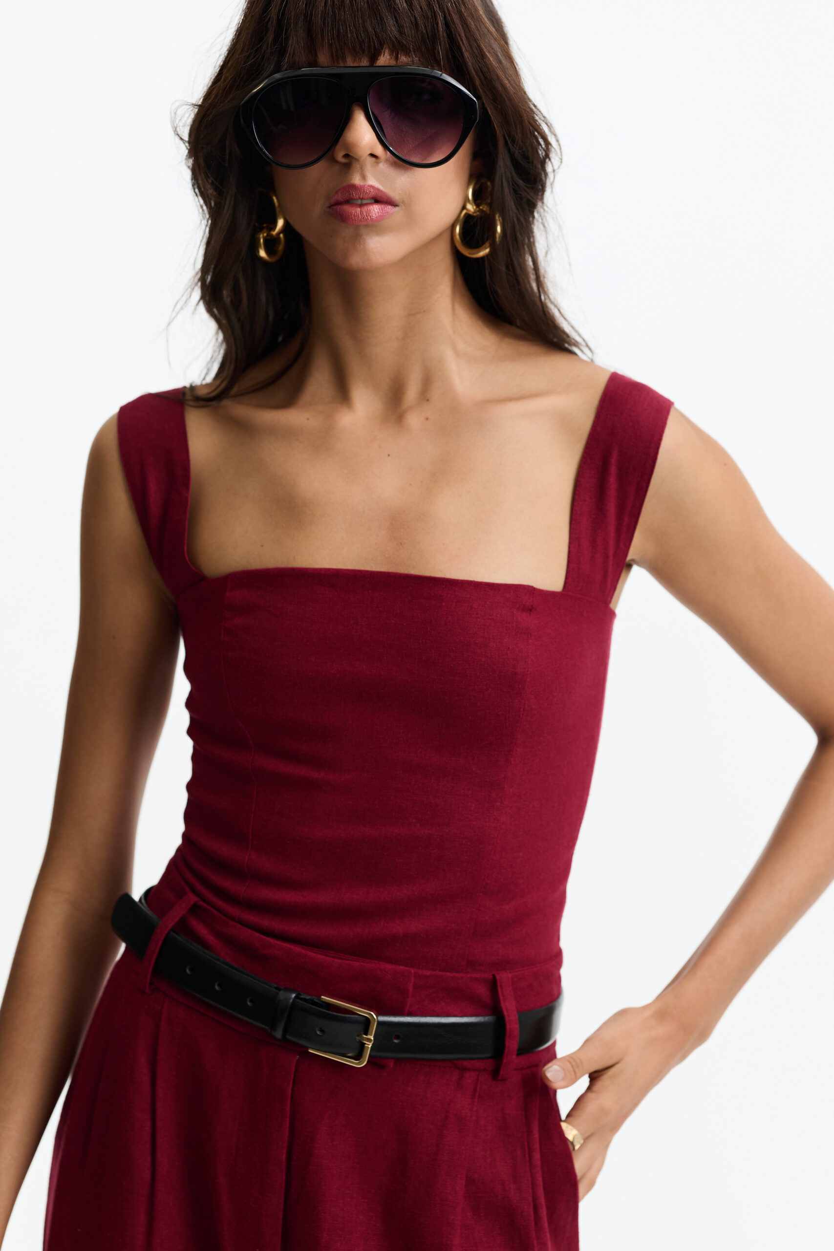 Nossa blusa Telma não possui mangas, possui a gola mais rente ao pescoço e um fechamento nas costas por botão forrado. Com frente dupla do mesmo tecido, a peça não possui transparência, e seu comprimento é rente ao cós da calça. É uma peça coringa, minimalista e chique. Funciona tão bem para um evento tipo esporte fino, quanto para um passeio no entardecer ou um jantar especial.
