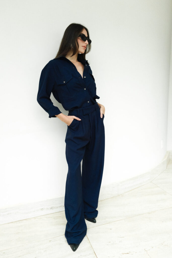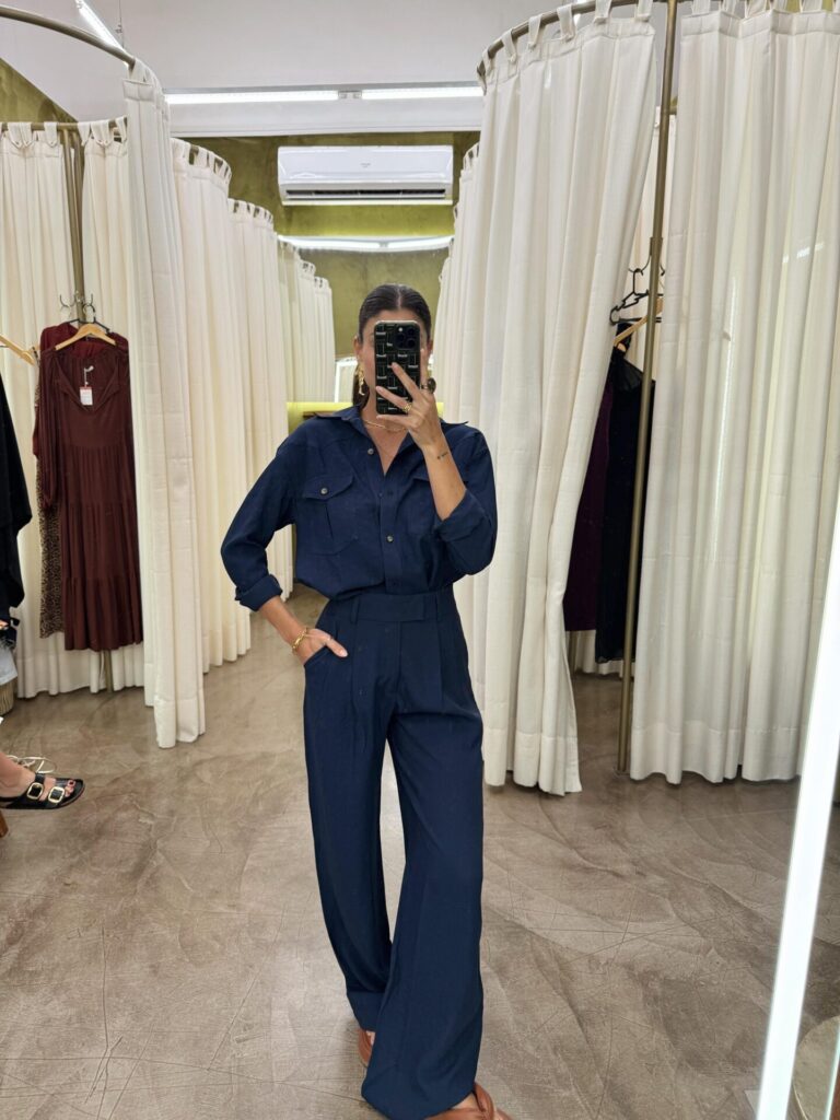 Nossa Calça Lívia possui uma modelagem que alonga e valoriza a silhueta. A cintura alta e estruturada, com cós reto e passantes, garante ajuste perfeito e um visual bem definido, ideal para composições sofisticadas. O fechamento frontal com zíper, ganchos fixos e botão interno reforça a segurança e um acabamento limpo da peça. A modelagem pantalona ampla oferece movimento e conforto ao caminhar, enquanto o tecido encorpado, porém maleável, confere fluidez e leveza sem perder a formalidade. Um modelo versátil, que transita com facilidade do ambiente profissional ao casual chic.