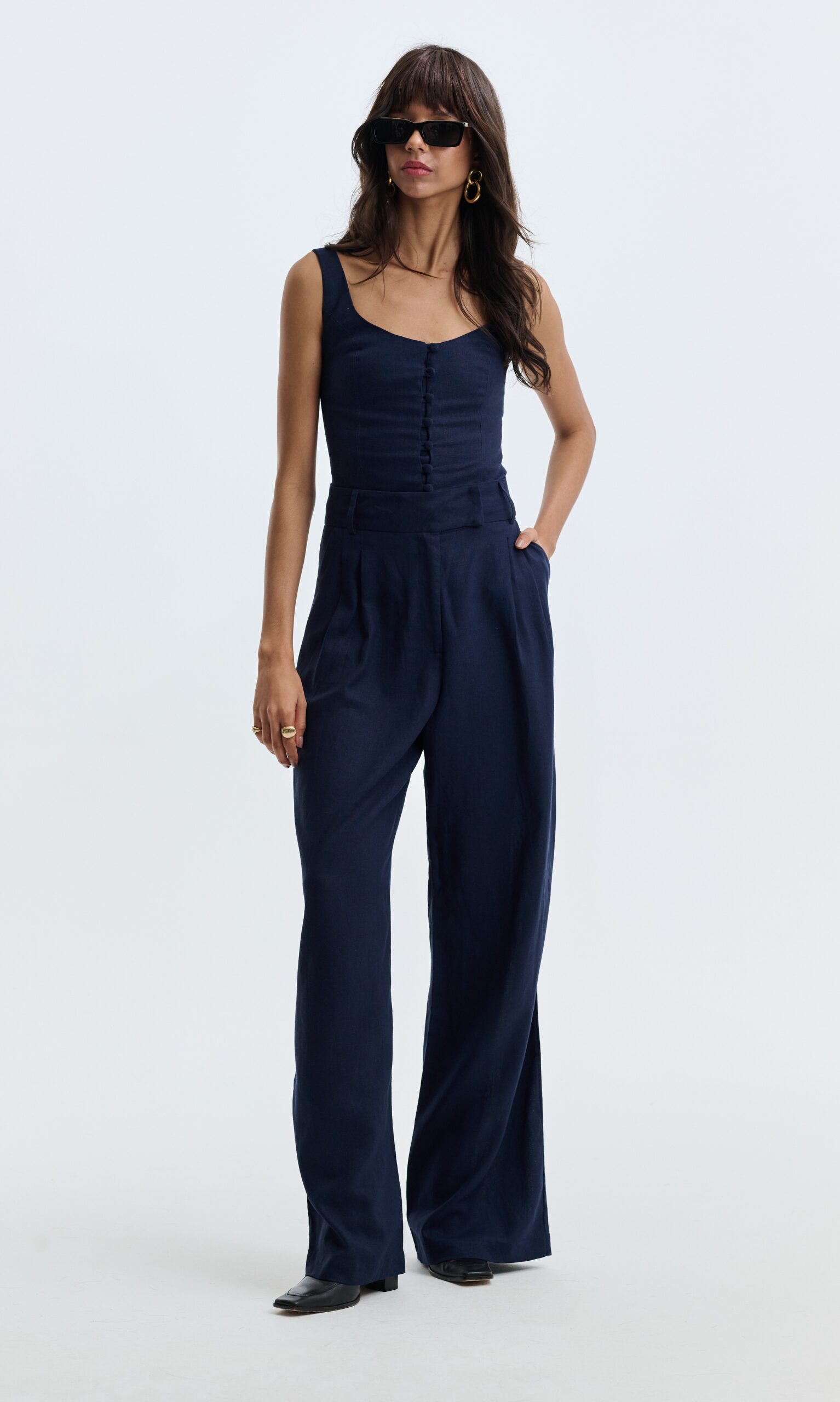 A pantalona Eliza é uma peça leve e versátil, possui a modelagem mais ampla, com corte reto, pregas frontais e cintura alta. Fechamento frontal por colchete duplo e zíper comum.