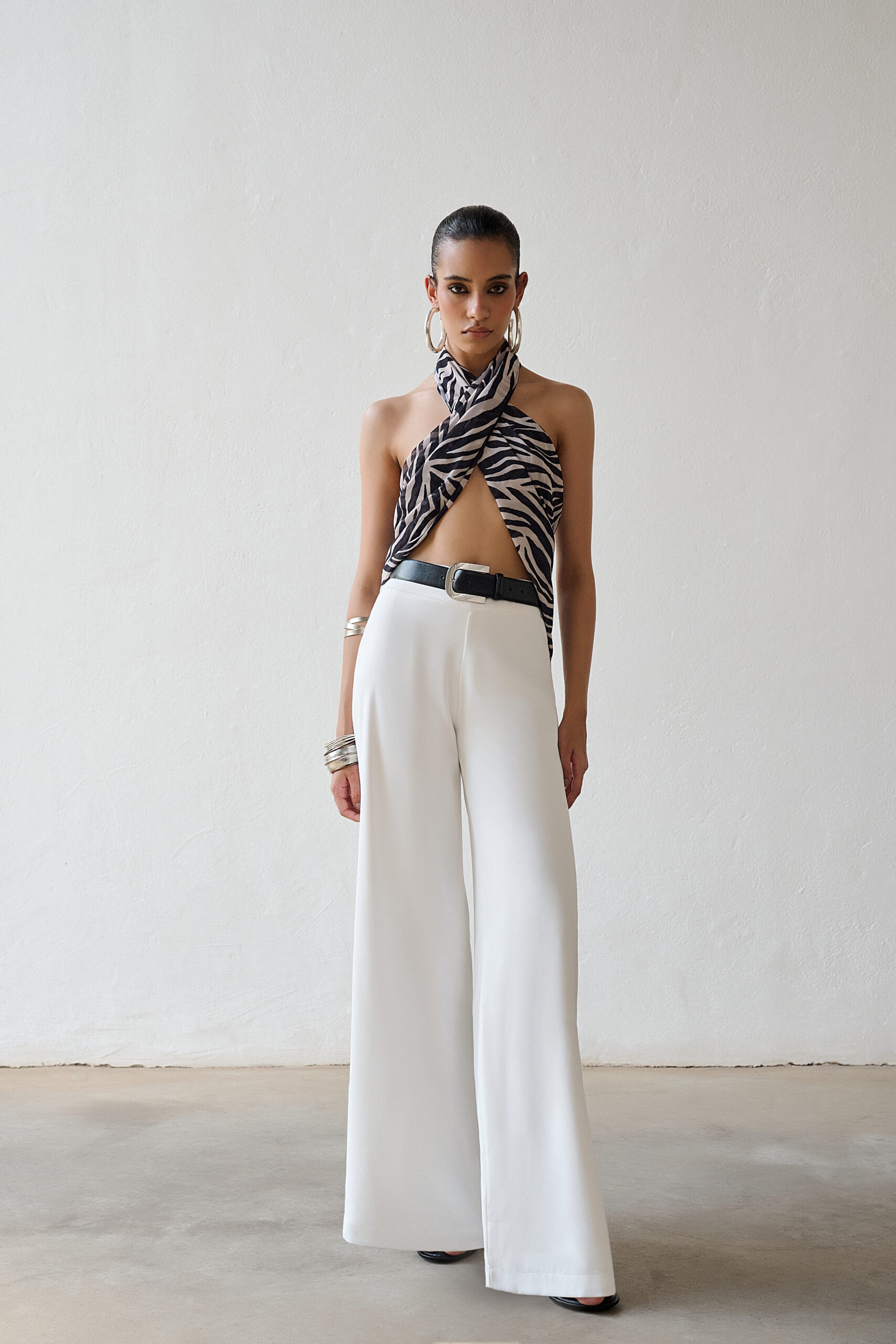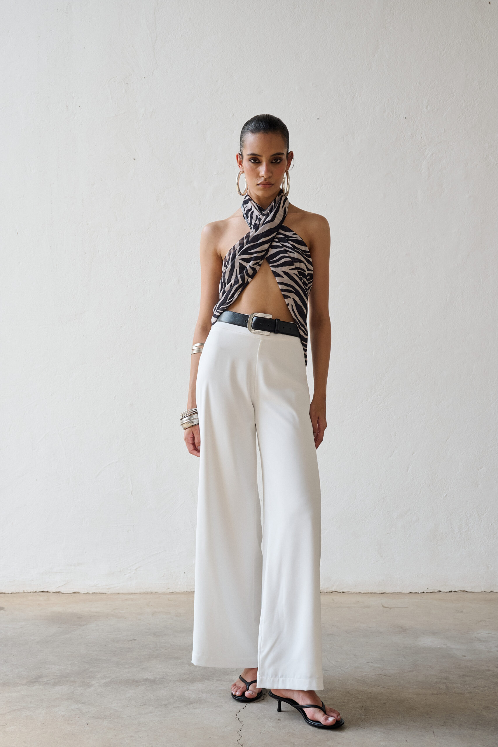 A nossa calça Lívia é confeccionada em tecido leve e versátil, possui a modelagem mais ampla, com corte reto, pregas frontais e cintura alta. Fechamento frontal por colchete duplo e zíper comum.