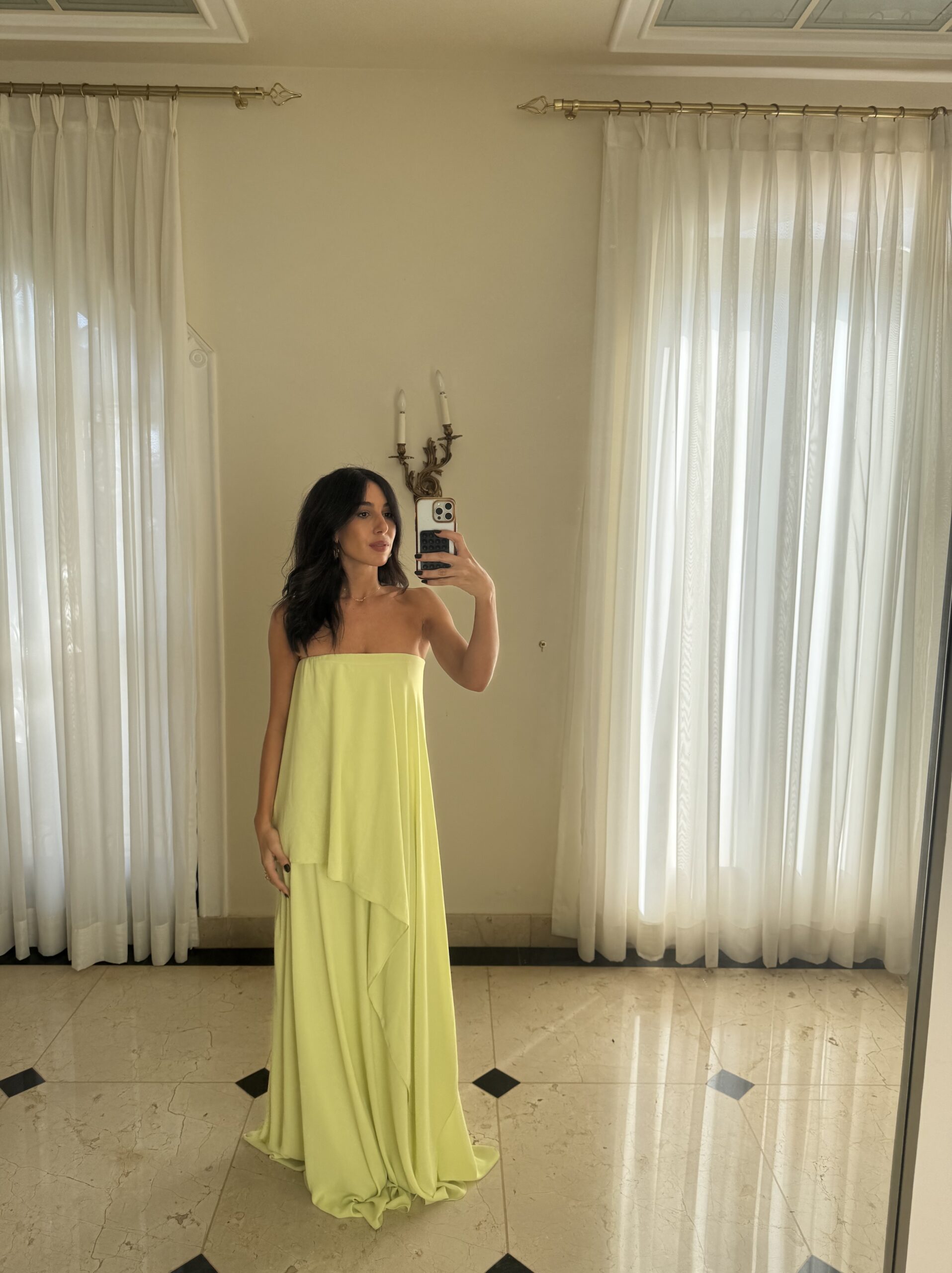 O Conjunto Siena longo em amarelo-limão é a perfeita fusão entre leveza e sofisticação. Com modelagem tomara que caia e sobreposição assimétrica, a peça valoriza o movimento fluido do tecido e cria impacto visual refinado. Sua tonalidade vibrante transmite frescor e presença, tornando-o ideal para eventos especiais, jantares ao ar livre e produções que pedem elegância com modernidade.