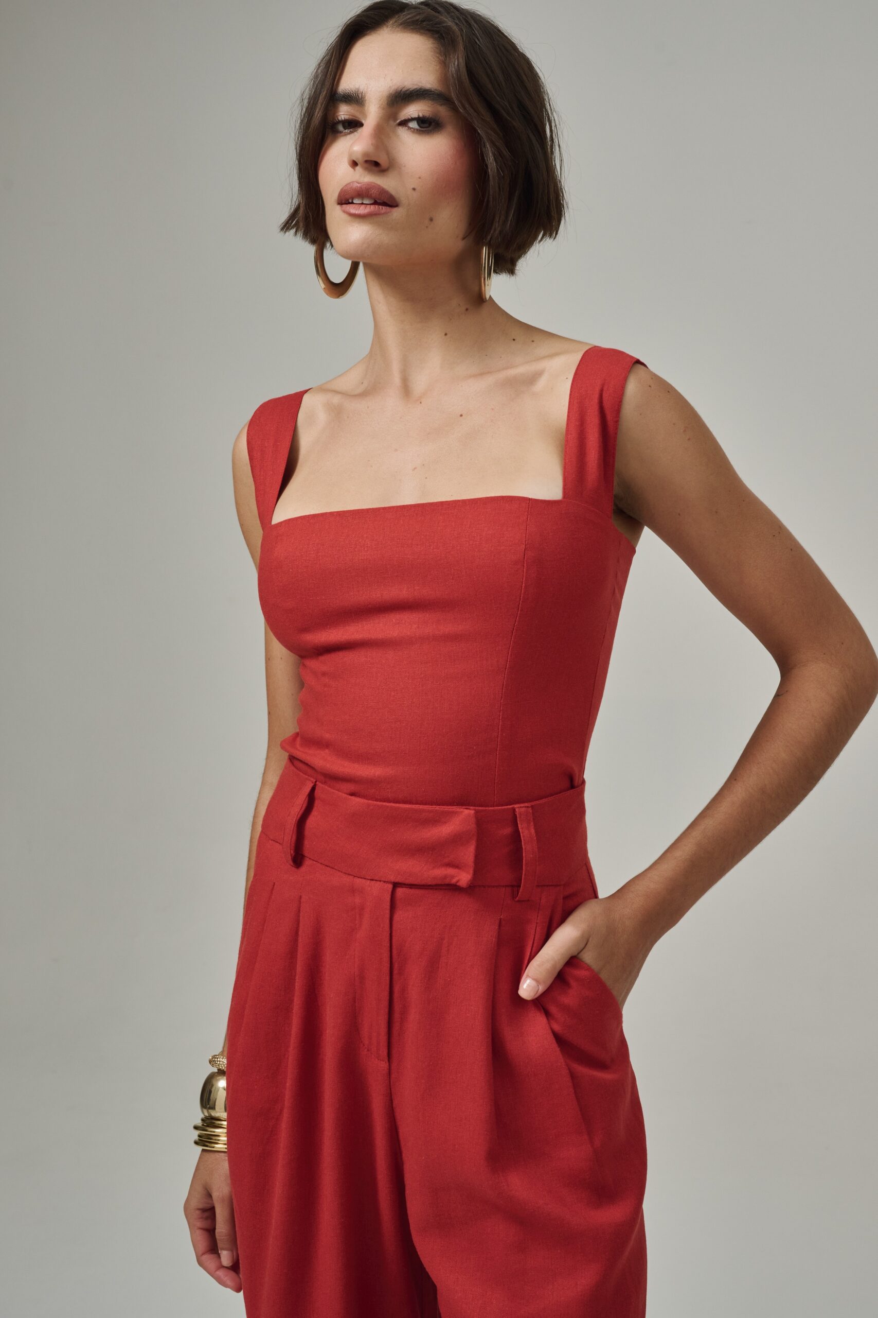 Nossa blusa Telma não possui mangas, possui a gola mais rente ao pescoço e um fechamento nas costas por botão forrado. Com frente dupla do mesmo tecido, a peça não possui transparência, e seu comprimento é rente ao cós da calça. É uma peça coringa, minimalista e chique. Funciona tão bem para um evento tipo esporte fino, quanto para um passeio no entardecer ou um jantar especial.