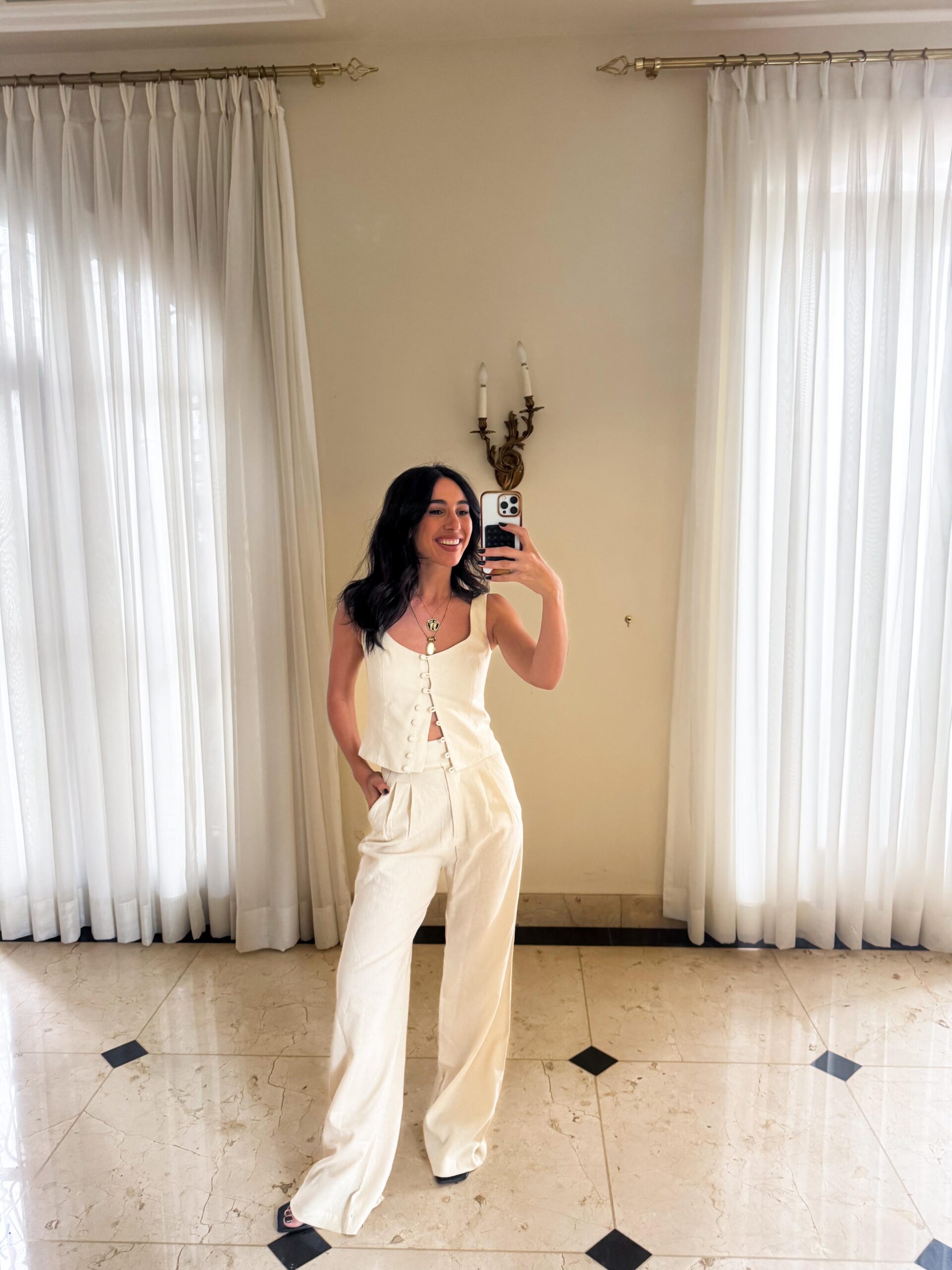 Nosso Corset Rita, é feito em linho, com recortes que trazem estrutura a peça. Todo duplo e com botões forrados, possui fechamento frontal através do abotoamento.