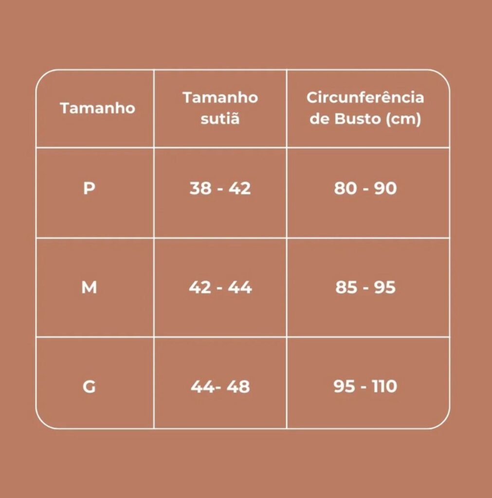 Observação: Todas as medidas estão em centímetros (cm). Para melhor ajuste, recomendamos tirar suas medidas com uma fita métrica.