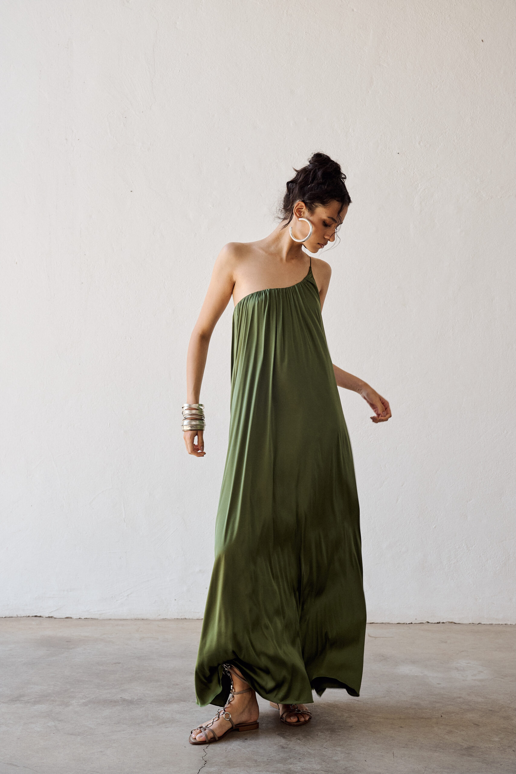 Vestido Acetinado Um Ombro Só Caetana – Verde Oliva