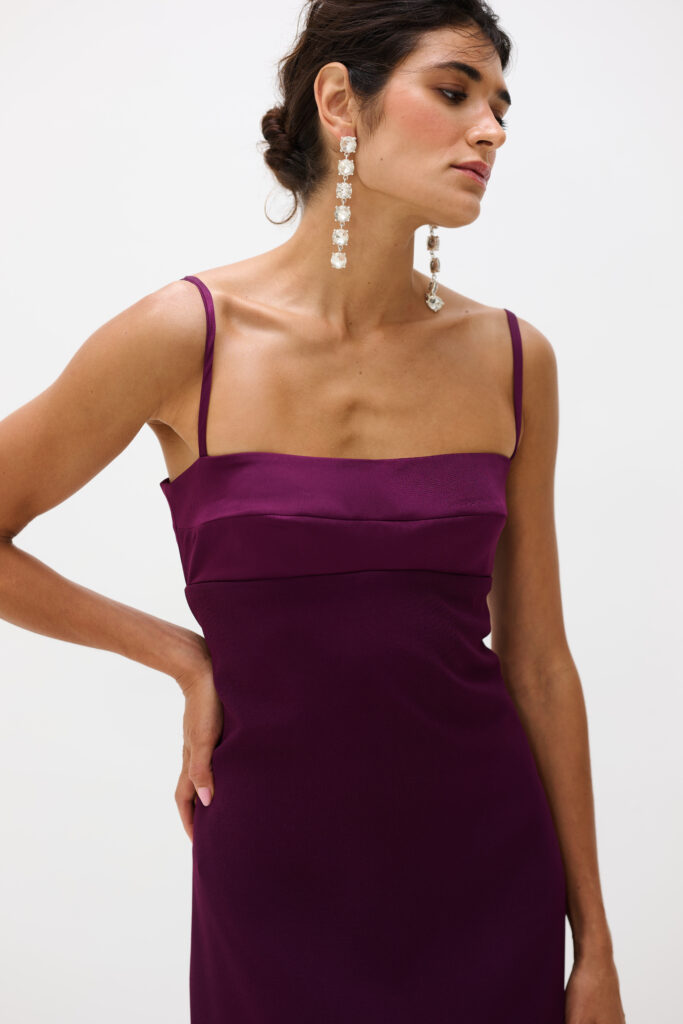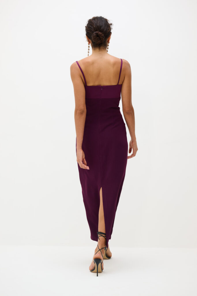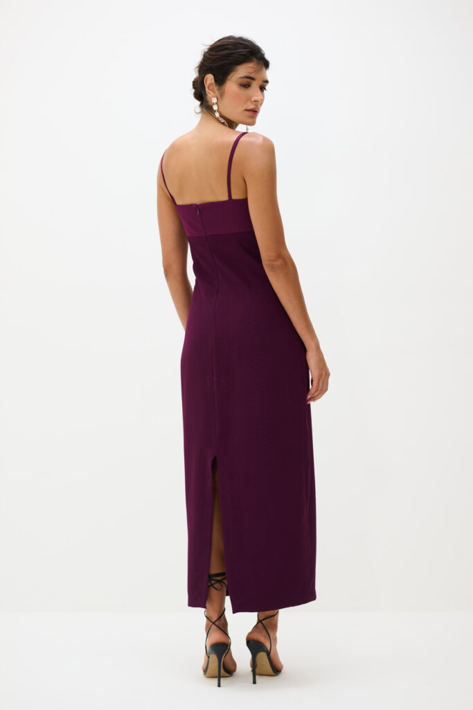 Nosso Vestido Aria possui caimento reto e elegante. A peça tem comprimento longuete, sendo ideal para produções noturnas ou ocasiões especiais. Possui busto estruturado com recorte abaixo do peito, alças finas delicadas e decote reto que destaca o colo com sofisticação, além de valorizar a silhueta com sua modelagem. O fechamento é através de um zíper na parte das costas e possui uma pequena fenda para dar um charme a mais ao vestido.