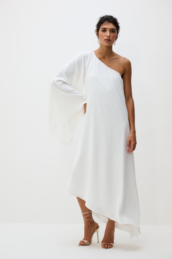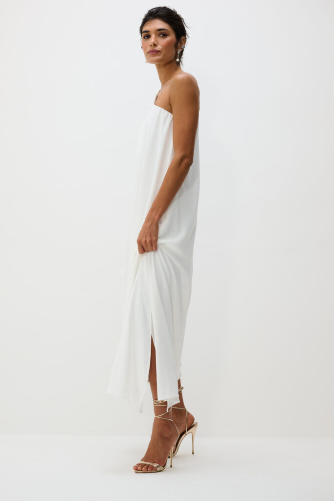 Nosso vestido Dih possui decote em V nas costas e amarração frente única, que possibilita outros acabamentos. Feito em crepe de alfaiataria bem fluido com peso, por ser todo duplo, criando um caimento bem bonito à peça. Decote em gota na parte do busto e comprimento longo.