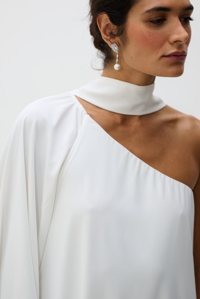 Permite o uso sem sutiã, não ficando transparente. O fechamento é através de um zíper na parte das costas.