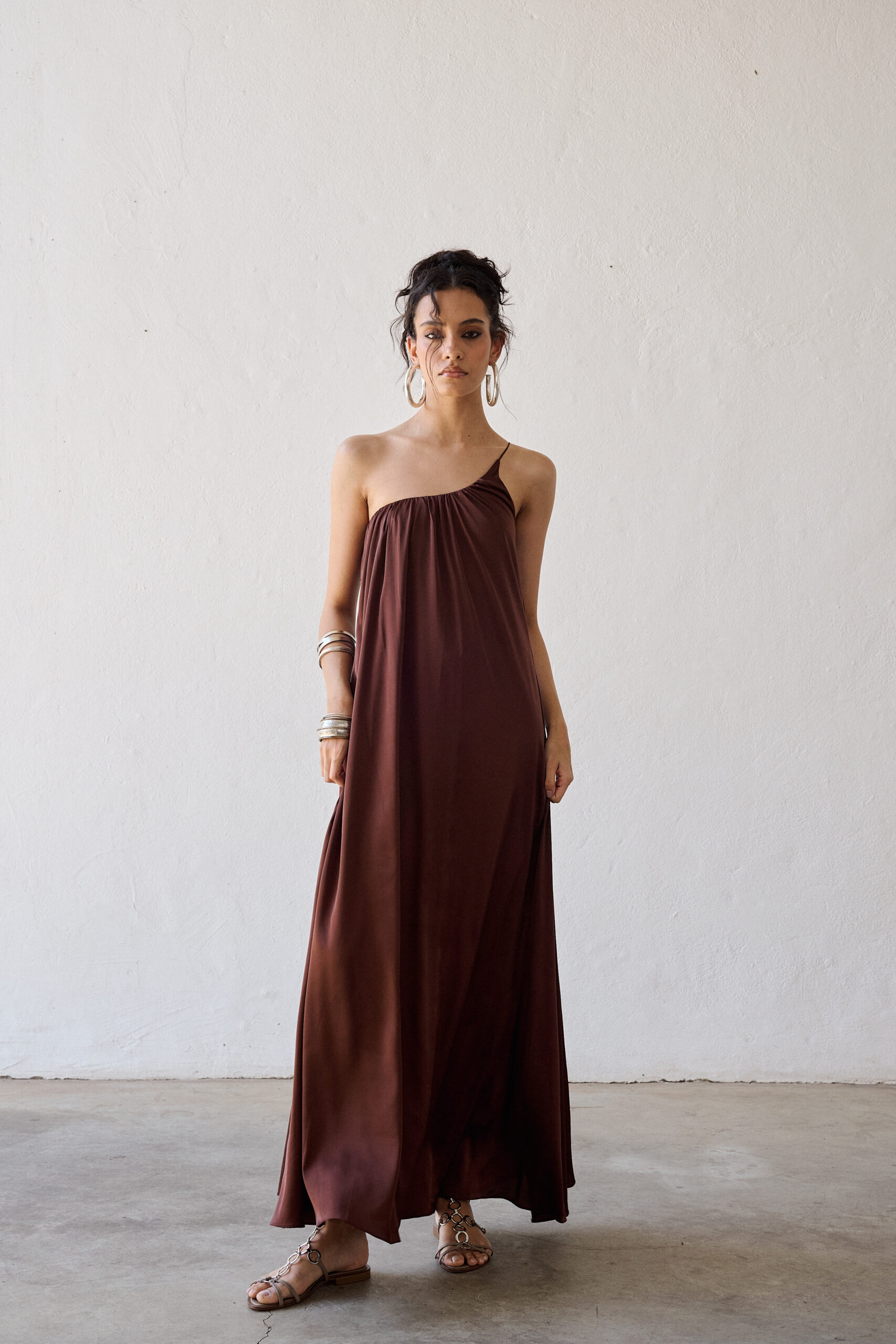 Vestido Acetinado Um Ombro Só Caetana – Marrom