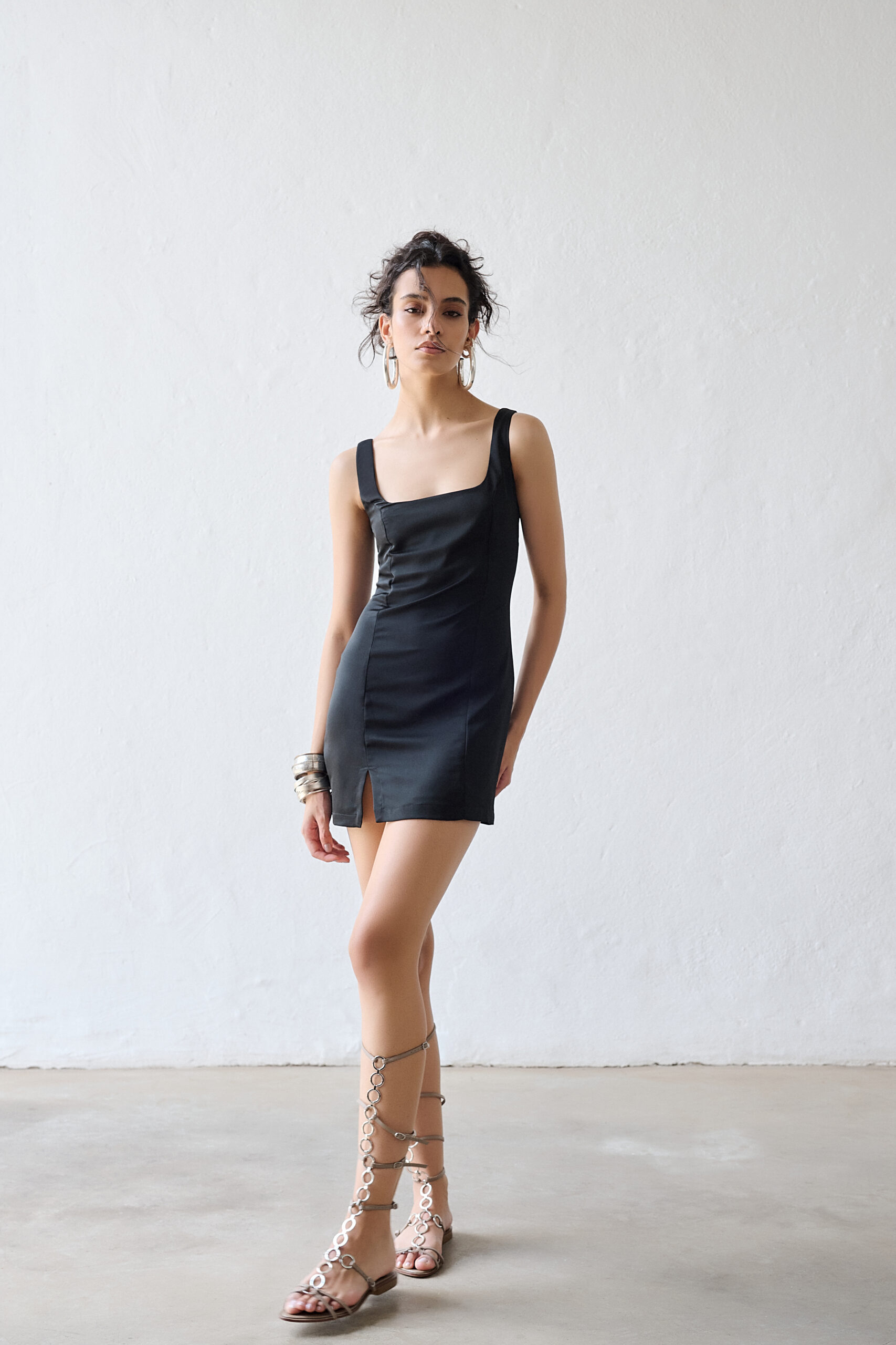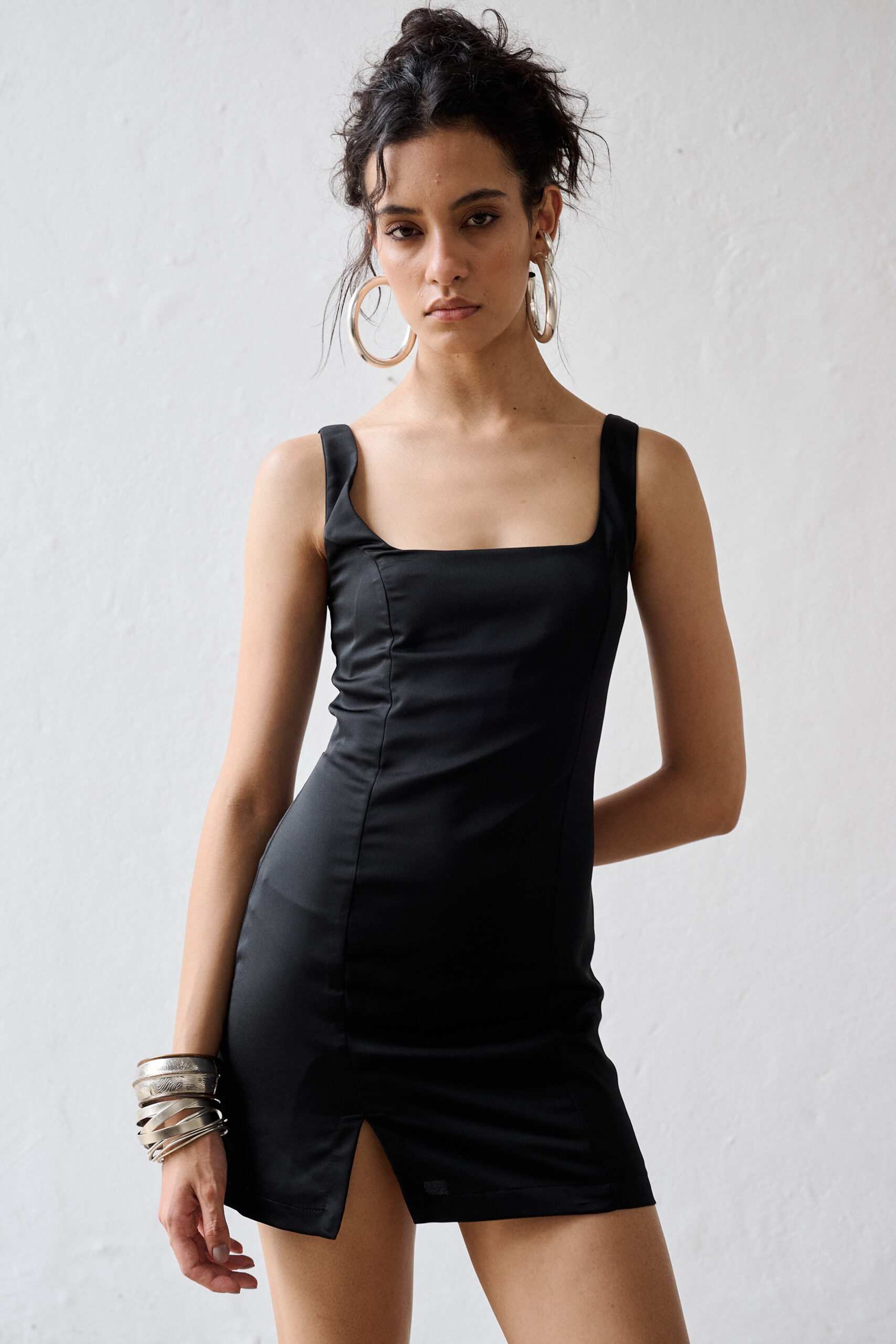 Feito em cetim bem fluido, criando um caimento bem bonito à peça, que possui uma fenda frontal.