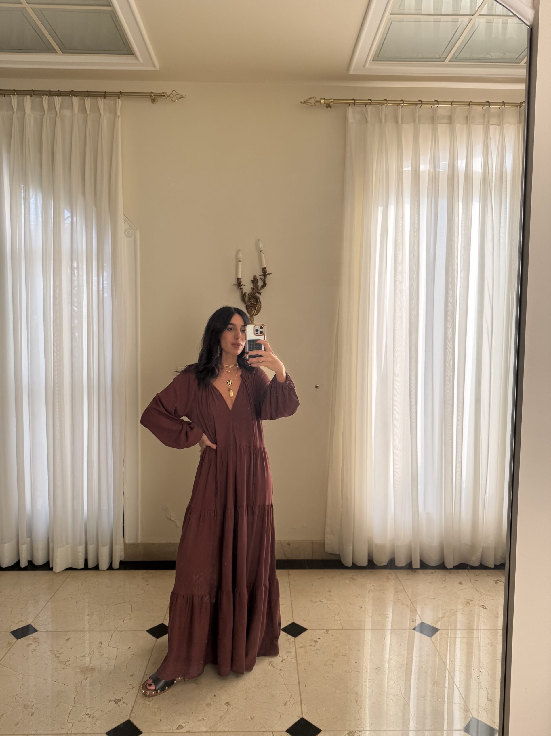 O vestido longo com decote V e mangas longas é uma peça que une intensidade e sofisticação. Sua modelagem ampla em camadas garante movimento fluido e leveza. O decote ajustável por amarração adiciona versatilidade ao design, equilibrando modernidade e feminilidade. Ideal para eventos especiais, jantares, produções refinadas, ou até mesmo eventos mais casuais. O vestido traduz elegância atemporal com toque contemporâneo.