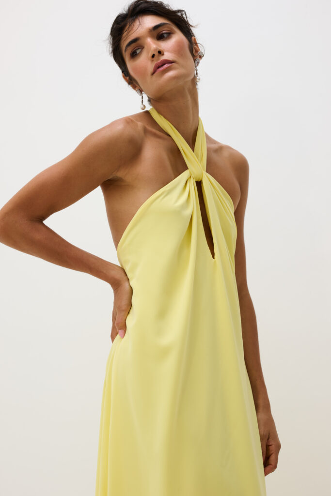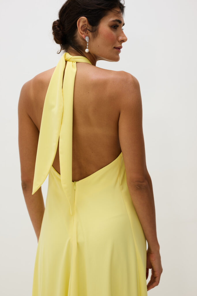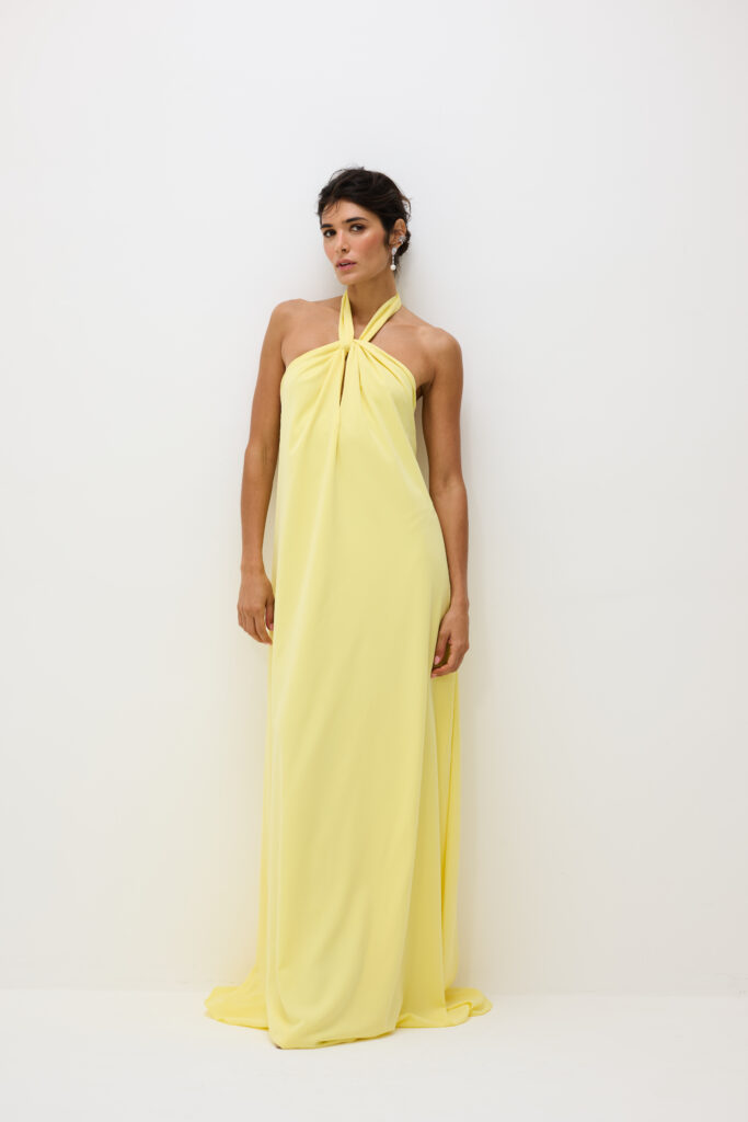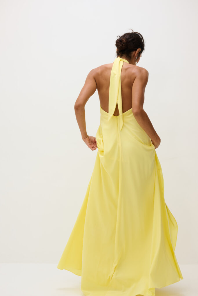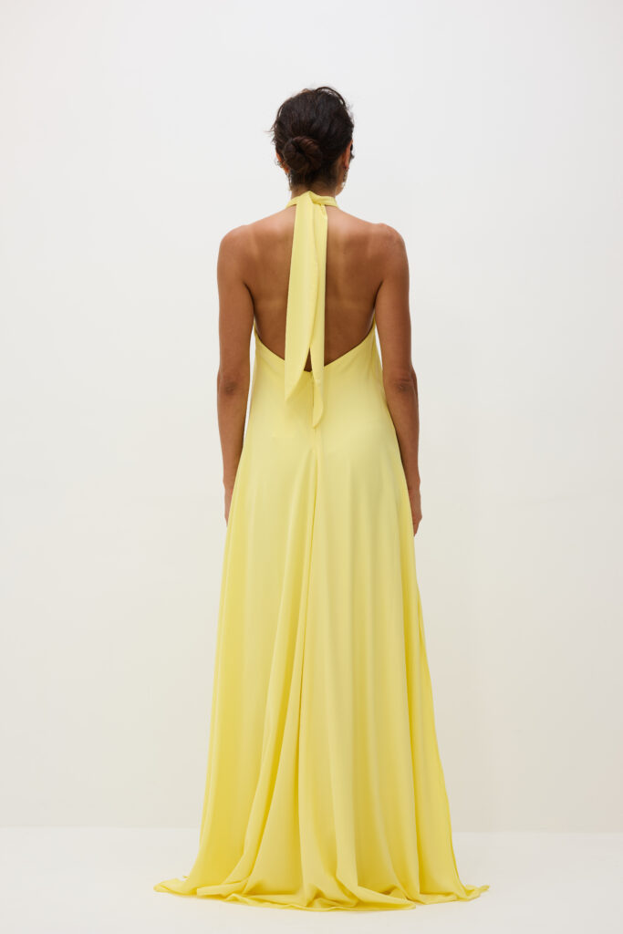 Nosso vestido Dih possui decote em V nas costas e amarração frente única, que possibilita outros acabamentos. Feito em crepe de alfaiataria bem fluido com peso, por ser todo duplo, criando um caimento bem bonito à peça. Decote em gota na parte do busto e comprimento longo.