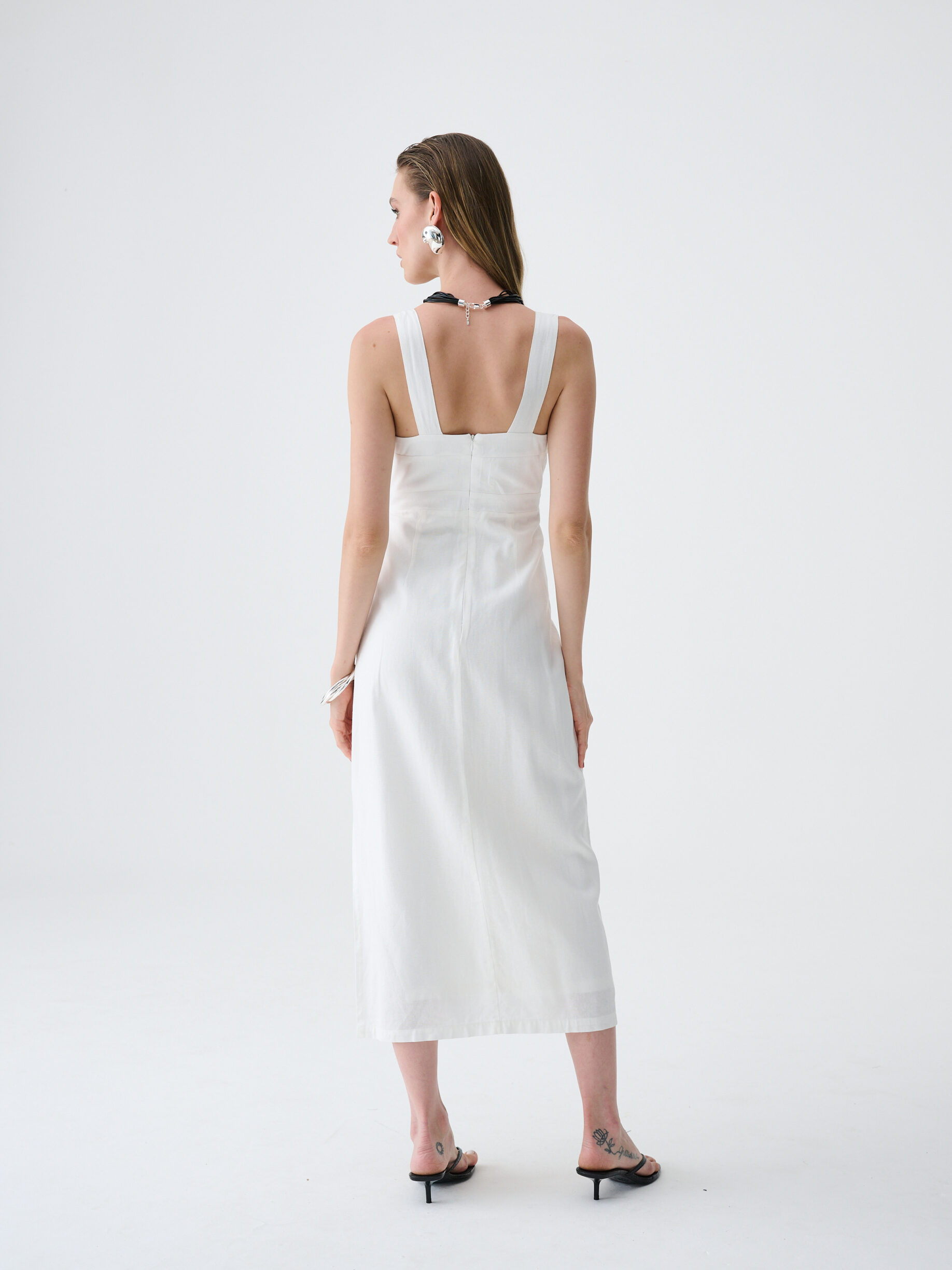 Nosso vestido Dih possui decote em V nas costas e amarração frente única, que possibilita outros acabamentos. Feito em crepe de alfaiataria bem fluido com peso, por ser todo duplo, criando um caimento bem bonito à peça. Decote em gota na parte do busto e comprimento longo.