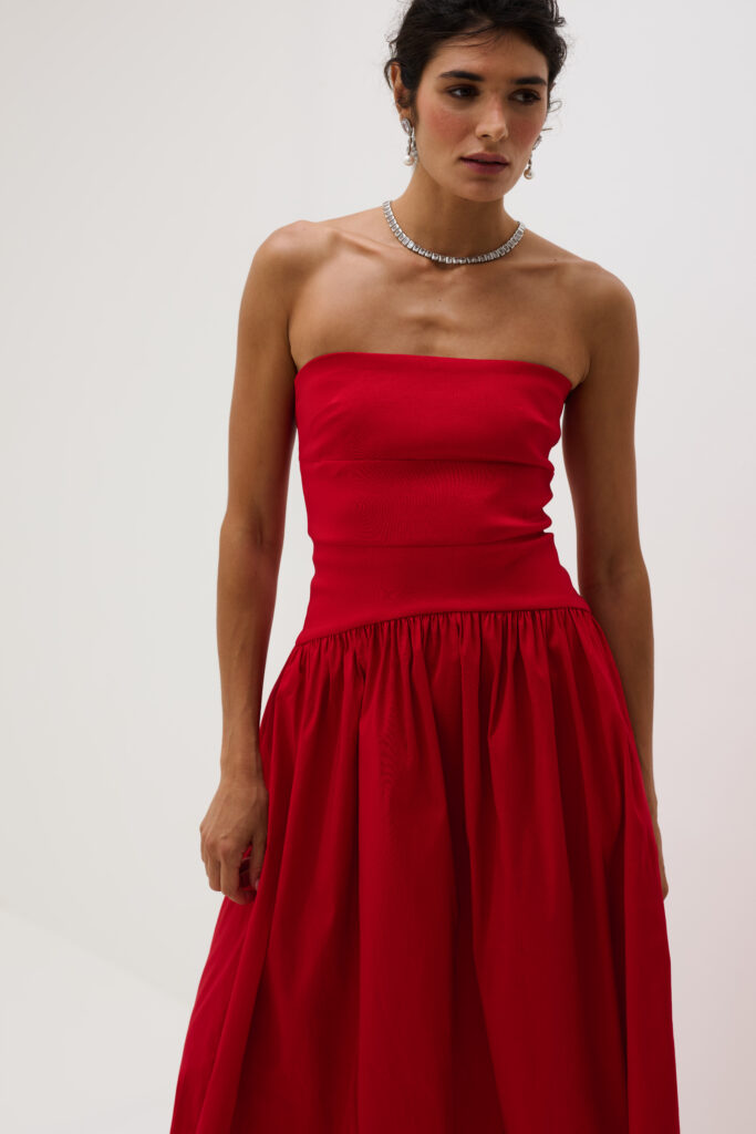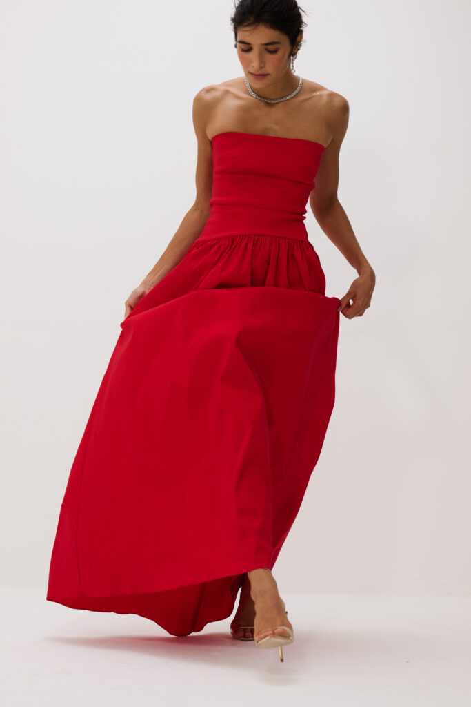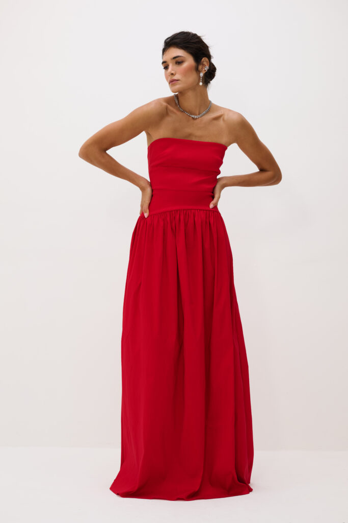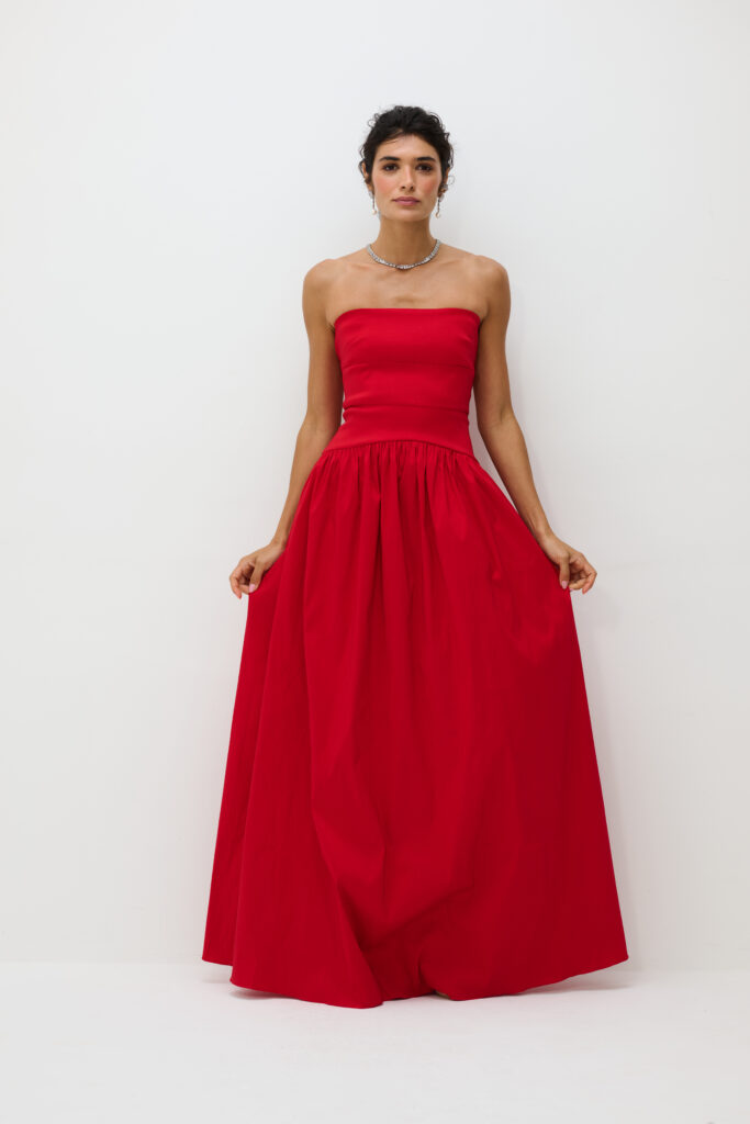 O vestido longo em tafetá Eugênia é a expressão do refinamento atemporal. Com modelagem tomara que caia e saia ampla, a peça combina estrutura e movimento de forma equilibrada. O tecido encorpado realça a intensidade da cor e confere presença marcante, enquanto o brilho traz sofisticação discreta. O design pode ser usado com ou sem a Echarpe que acompanha a peça, oferecendo versatilidade e impacto visual. Ideal para eventos noturnos, jantares formais e ocasiões que pedem imponência elegante.