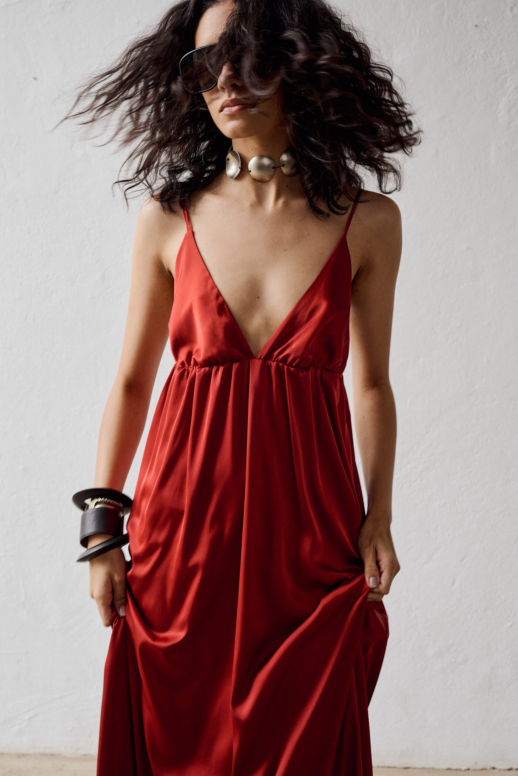 O Vestido Longo Mercedes é a personificação do glamour descontraído. Confeccionado em um tecido acetinado vibrante, ele se destaca pelo seu sofisticado tom terracota, garantindo uma presença marcante e atemporal. Com alças delicadas e um decote em V sutil, ele valoriza o colo enquanto o caimento fluido e esvoaçante da saia longa confere um movimento leve e dramático a cada passo. É a escolha perfeita para quem busca combinar elegância com um toque de sensualidade na medida.