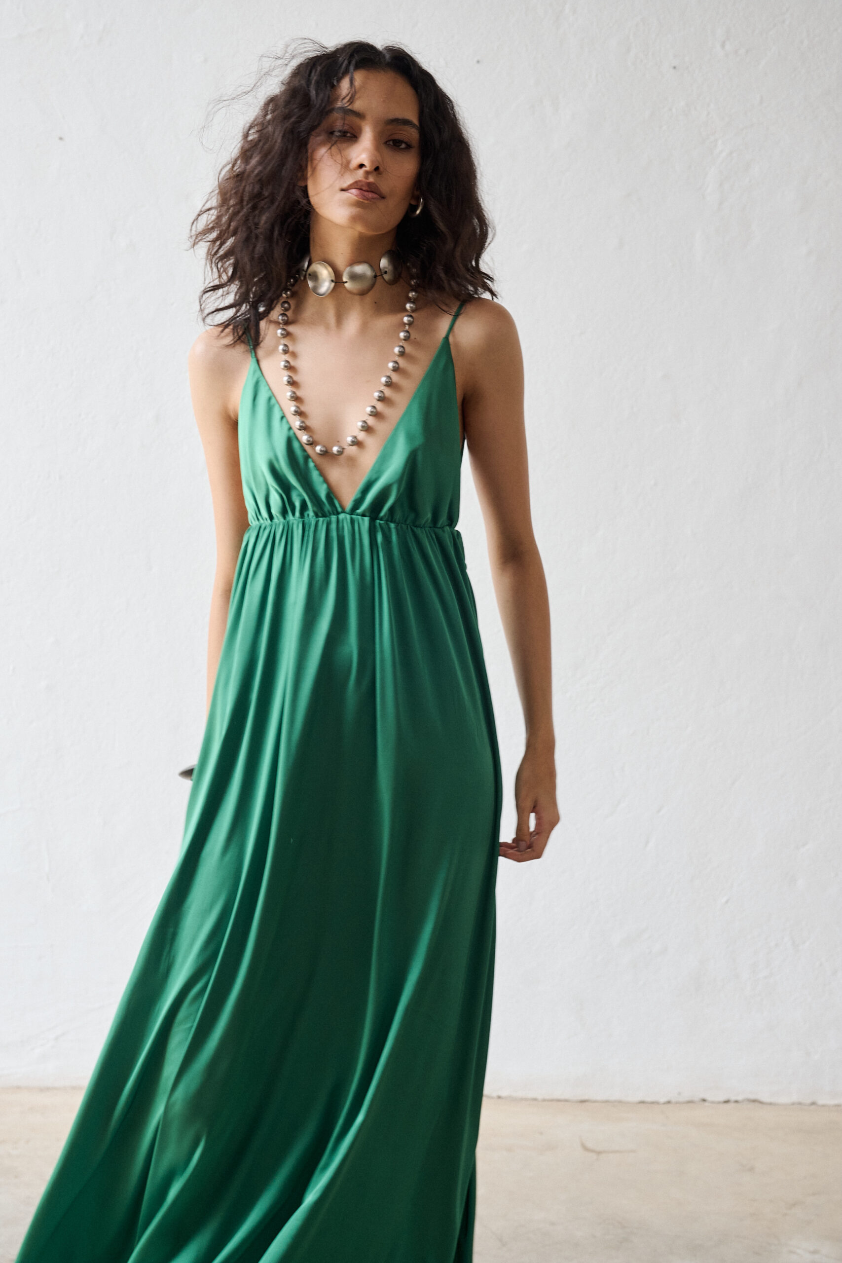 O Vestido Longo Mercedes é a personificação do glamour descontraído. Confeccionado em um tecido acetinado vibrante, ele se destaca pelo seu sofisticado tom verde, garantindo uma presença marcante e atemporal. Com alças delicadas e um decote em V sutil, ele valoriza o colo enquanto o caimento fluido e esvoaçante da saia longa confere um movimento leve e dramático a cada passo. É a escolha perfeita para quem busca combinar elegância com um toque de sensualidade na medida.