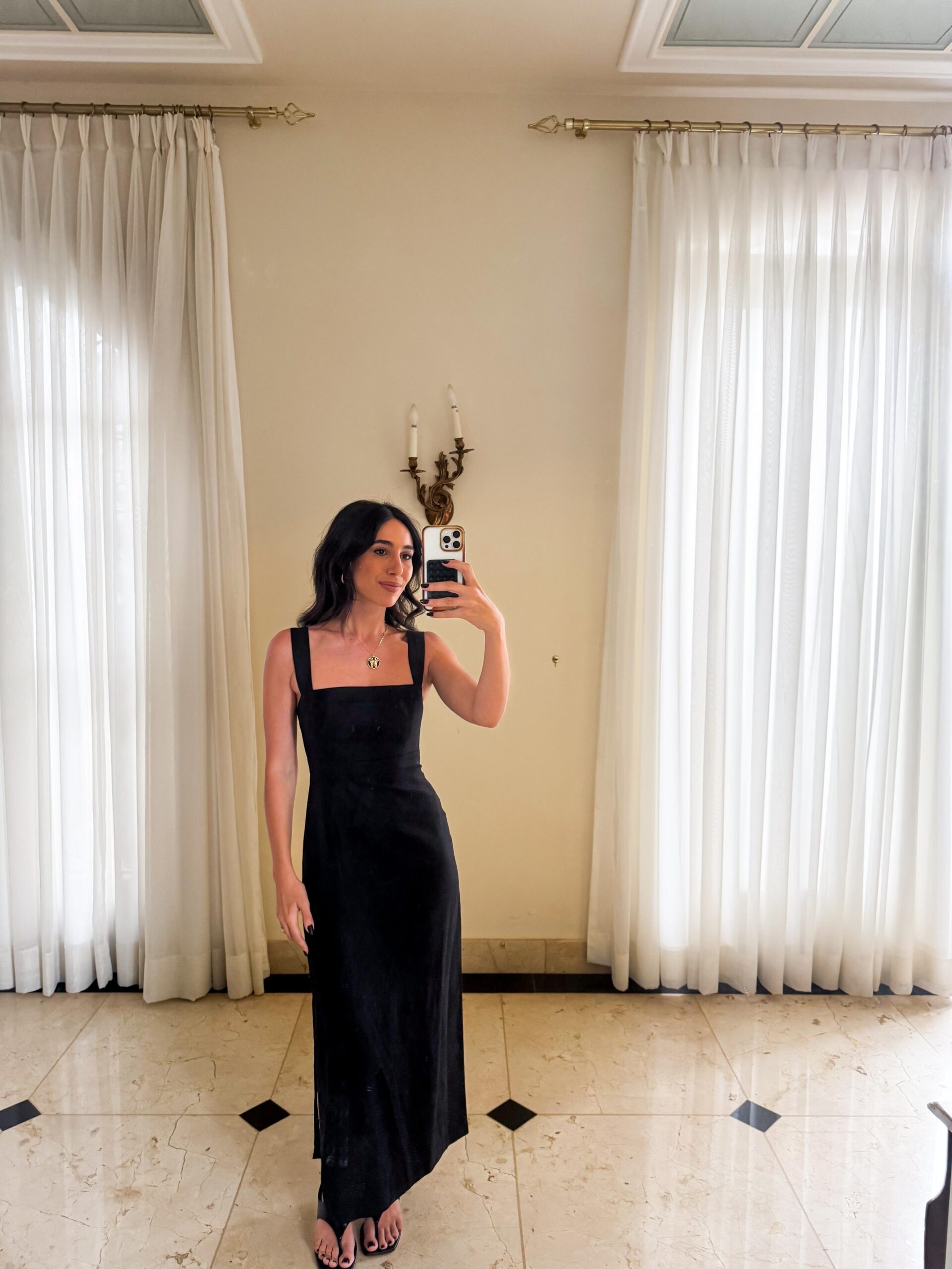 Nosso vestido Dih possui decote em V nas costas e amarração frente única, que possibilita outros acabamentos. Feito em crepe de alfaiataria bem fluido com peso, por ser todo duplo, criando um caimento bem bonito à peça. Decote em gota na parte do busto e comprimento longo.